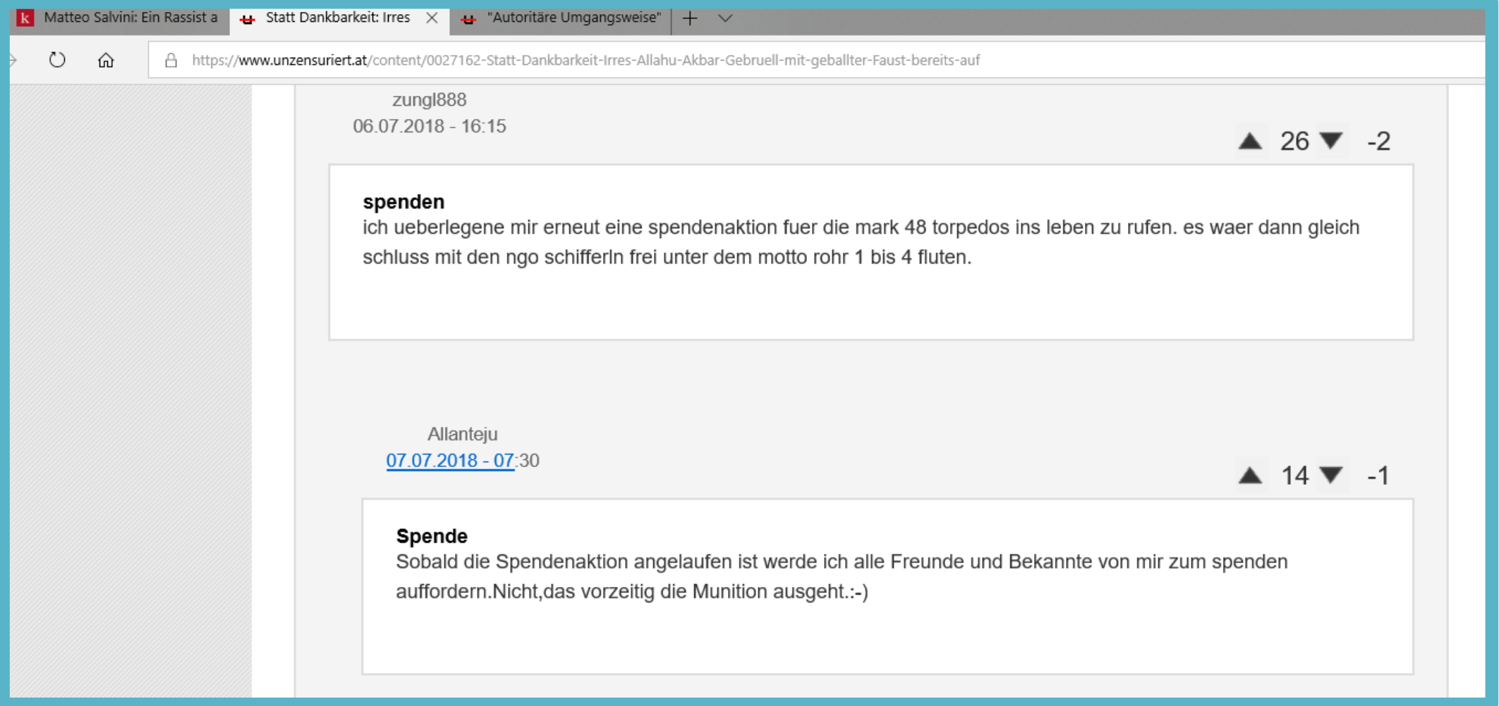 Daß einer oder eine auf der gesinnungsgemäß zensurierten Website der identitären Regierungspartei in Österreich ihren oder seinen (oder welches Geschlecht diese posting person auch immer haben mag) Spendenaufruf für „Mark 48 Torpedos“ vom Juni 18 im Juli 18 erneuert, also das Spendensammeln für die Anschaffung von Massenmordwaffen, ist eigentlich nicht ein zweites Mal erwähnenswert; wo sonst als auf einer solchen Website können derartige Aufrufe wieder und wieder … es bleibt unzensuriert, was unzensuriert zu sein hat …