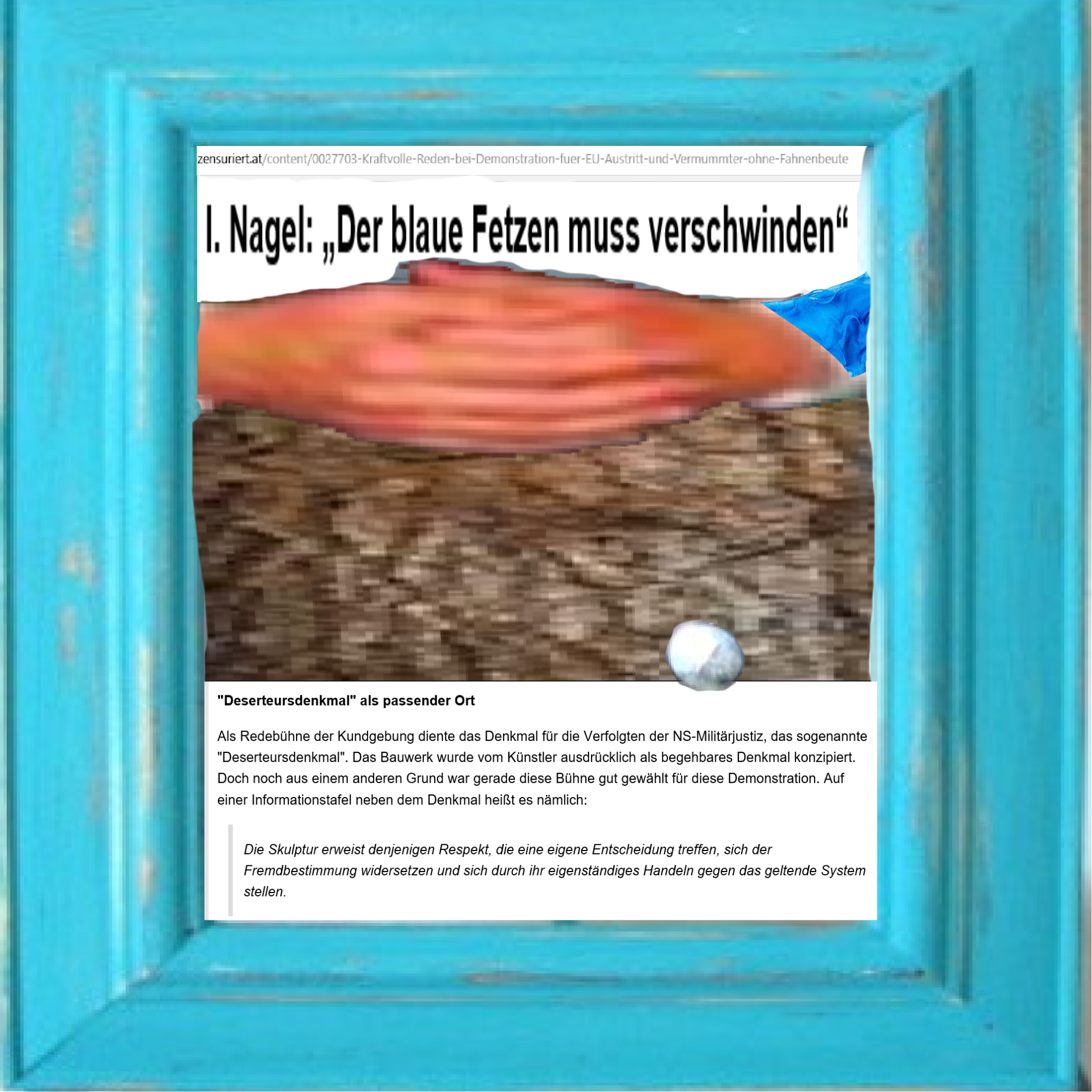 Wie hoffe ich darauf, es mögen schon in kürzester Zeit mehr Nägel in den Mikrophonstumpenständer als in den „Wehrmann aus Eisen“ eingeschlagen sein und dadurch mehr Spenden zusammenkommen als in der Vergangenheit für den Krieg und die Ertränkung der Menschen in heimatlicher Gewalt, um mit den Spenden friedlich das Arbeiten an dem Machtende dieser zurzeitigen Regierung zu ermöglichen, das Geld zu verwenden, vielleicht für die Gründung einer Wahlplattform mit einem besseren Angebot an die Menschen als dieses von diesen zwei Parteien, die zur Regierung gemacht wurden, ohne zu berücksichtigen, welche Angebote vor allem die Wählerinnen und weniger die Wähler für eine Koalition machten.