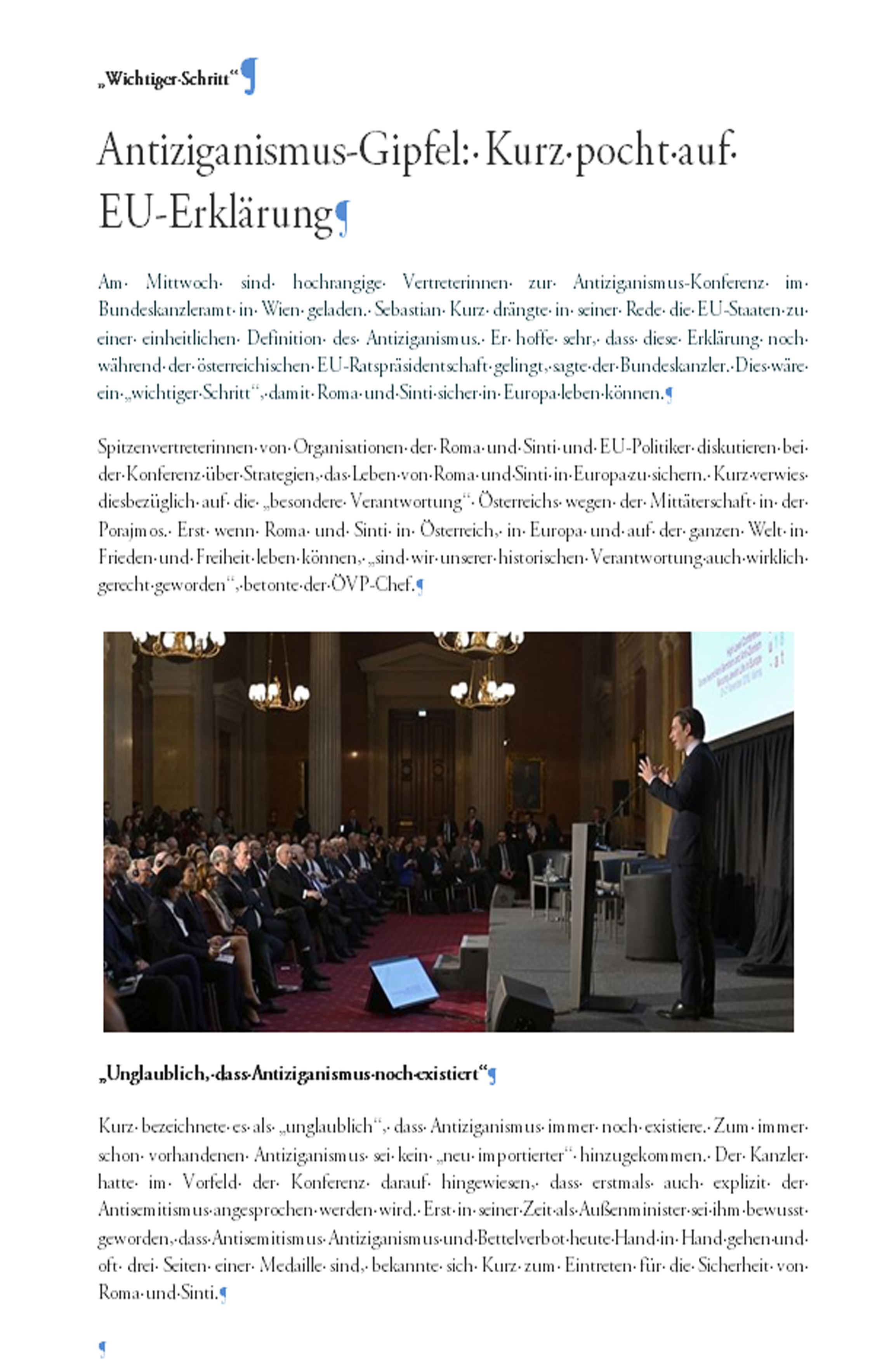Spitzenvertreterinnen von Organisationen der Roma und Sinti und EU-Politiker diskutieren bei der Konferenz über Strategien, das Leben von Roma und Sinti in Europa zu sichern. Kurz verwies diesbezüglich auf die „besondere Verantwortung“ Österreichs wegen der Mittäterschaft in der Porajmos. Erst wenn Roma und Sinti in Österreich, in Europa und auf der ganzen Welt in Frieden und Freiheit leben können, „sind wir unserer historischen Verantwortung auch wirklich gerecht geworden“, betonte der ÖVP-Chef.