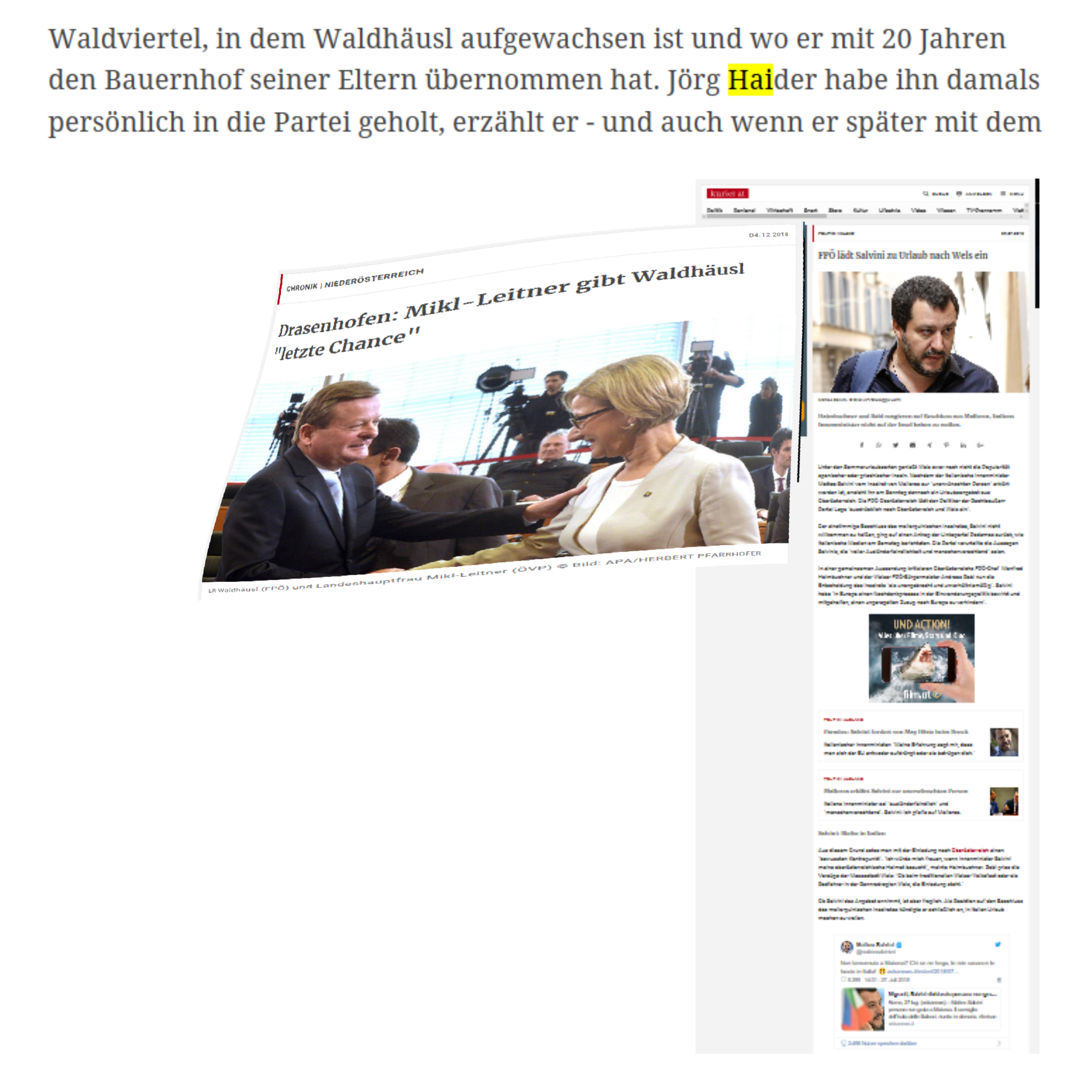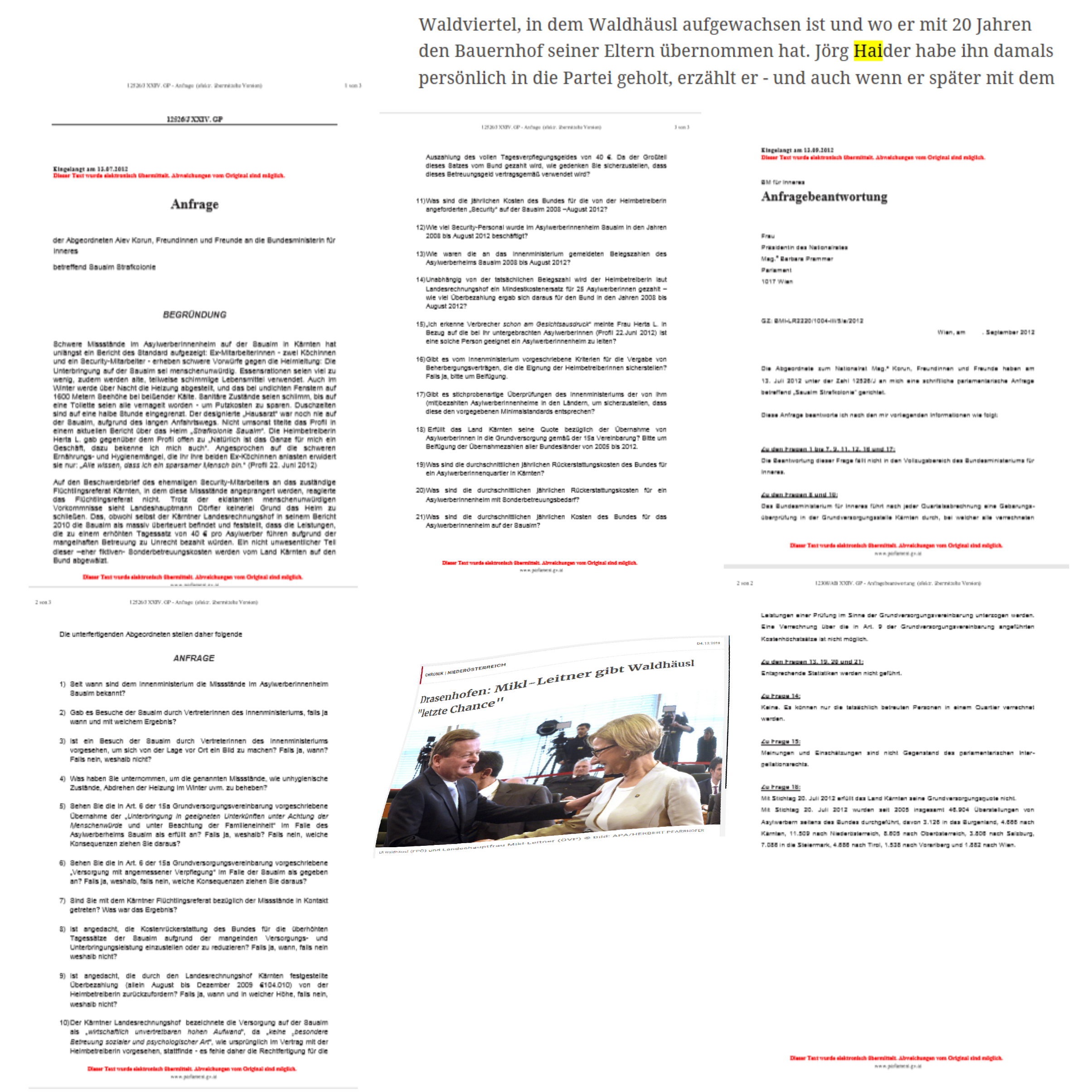 Das wird jene recht freuen, die mit tränenden Augen in die Asche Haiders selig schauen, das noch etwas zu dem, was von ihm geblieben ist, hinzugefügt werden kann: Drasenhofen. Schließlich stellte Haider persönlich Waldhäusl auf, und daß Waldhäusl heute auf dieser Position steht, auf der Waldhäusl steht, nun, seine Versetzungen auf immer höhere Positionen begann mit Jörg Haider.