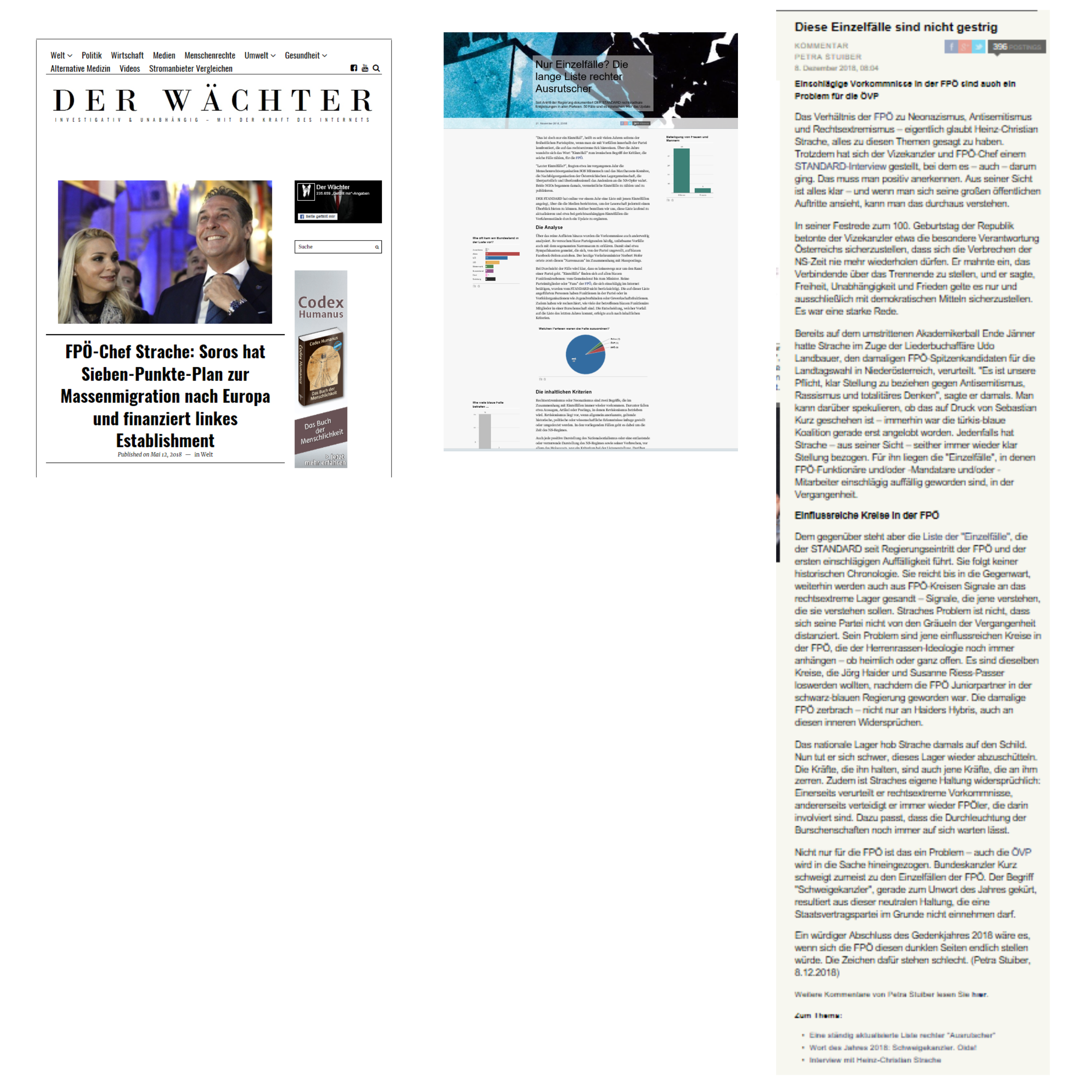 „Bereits auf dem umstrittenen Akademikerball Ende Jänner hatte Strache im Zuge der Liederbuchaffäre Udo Landbauer, den damaligen FPÖ-Spitzenkandidaten für die Landtagswahl in Niederösterreich, verurteilt. ‚Es ist unsere Pflicht, klar Stellung zu beziehen gegen Antisemitismus, Rassismus und totalitäres Denken‘, sagte er damals. Man kann darüber spekulieren, ob das auf Druck von Sebastian Kurz geschehen ist – immerhin war die türkis-blaue Koalition gerade erst angelobt worden. Jedenfalls hat Strache – aus seiner Sicht – seither immer wieder klar Stellung bezogen. Für ihn liegen die ‚Einzelfälle‘, in denen FPÖ-Funktionäre und/oder -Mandatare und/oder -Mitarbeiter einschlägig auffällig geworden sind, in der Vergangenheit.“