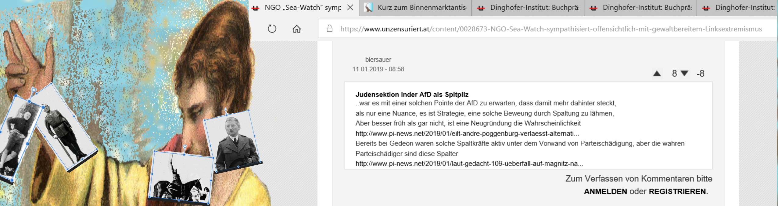 Jene aus der Schreibstaffel dieser Website und alle auf dieser Website, die den antisemitischen Kommentaren ihre Zustimmung in so recht hohem Ausmaß erteilen, sind ebenfalls nicht zu beneiden. Wie recht schwer muß es für sie zu verstehen sein, wenn ihre antisemitischen Kommentare und damit auch ihre Segnungen der antisemitischen Kommentare gelöscht werden, sind sie doch nur eins mit dieser Partei, deren Ikone ein … Gedenken sie doch nur mit ihren Kommentaren und Zustimmungen der Ikone auf ihre prunklose Art auf der gesinnungsgemäß zensurierten Website. Vielleicht sollten sie es ebenso prunkvoll gestalten, ihr Gedenken, wie es die identitäre Regierungspartei in Österreich macht, im Parlament, das für sie geistig in der Steingasse beheimatet, oder, wie am 9.1.19 in der Hofburg …