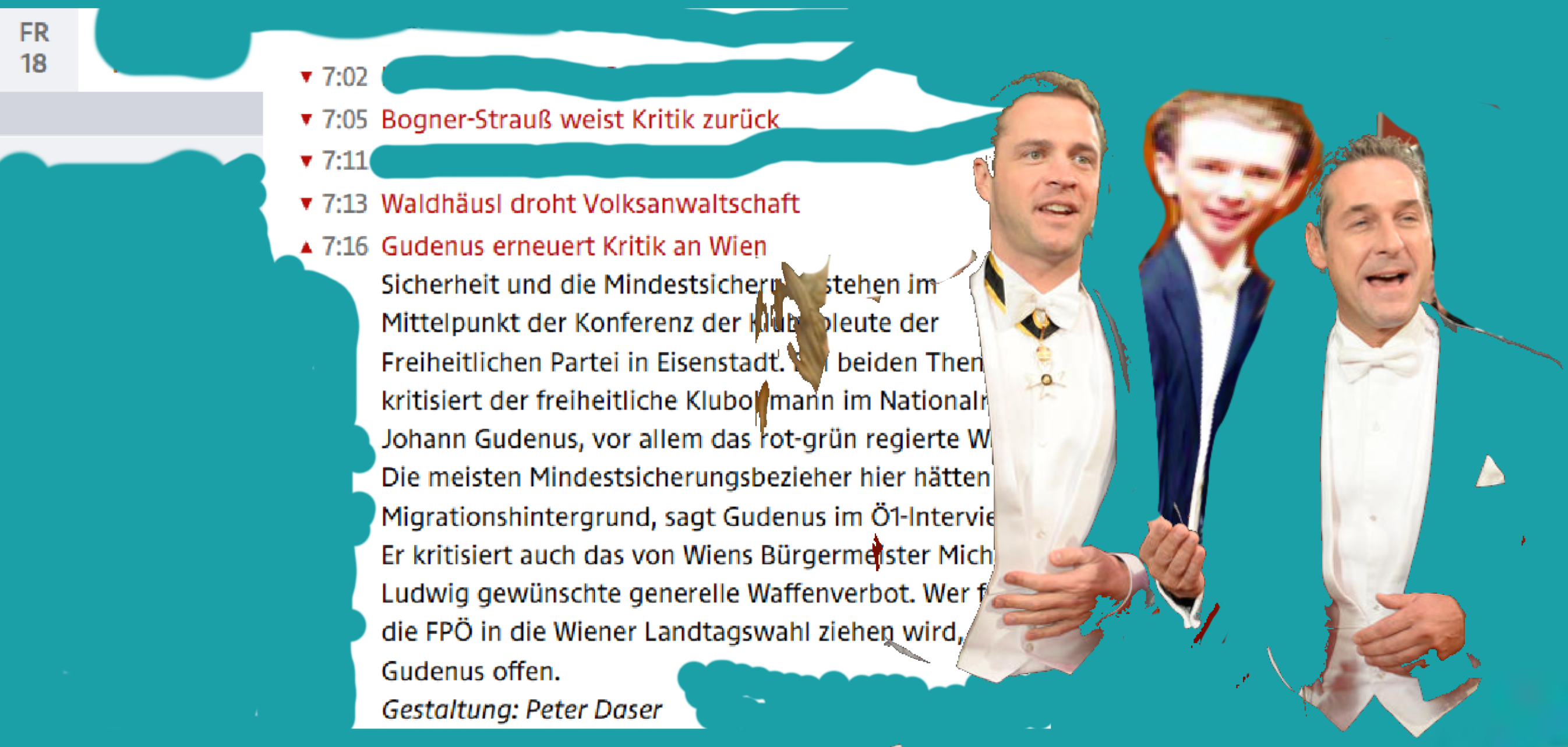 Wer Johann Gudenus gestrig am 18. gehört hat, in der Frühe am Radio, hat wieder einmal bestätigt bekommen, in welchem Alp Wien erwachen würde, auch Wien (wie jetzt schon ganz bundesgebietlich Österreich täglich zum Alptraum erwacht), sollten der Klubobmann der identitären Regierungspartei und die identitäre Regierungspartei je in Wien zu einem identitären Bürgermeister und je zu einer identitären Landesregierungspartei gemacht werden. Das wäre das nächste Montagsprodukt in Österreich, ganz gleich an welchem Wochentag die Angelobung gemacht werden würde, und ein Montagsprodukt steht seit jeher für ein schlechtes Produkt, für das gemachte fehlerreich …
