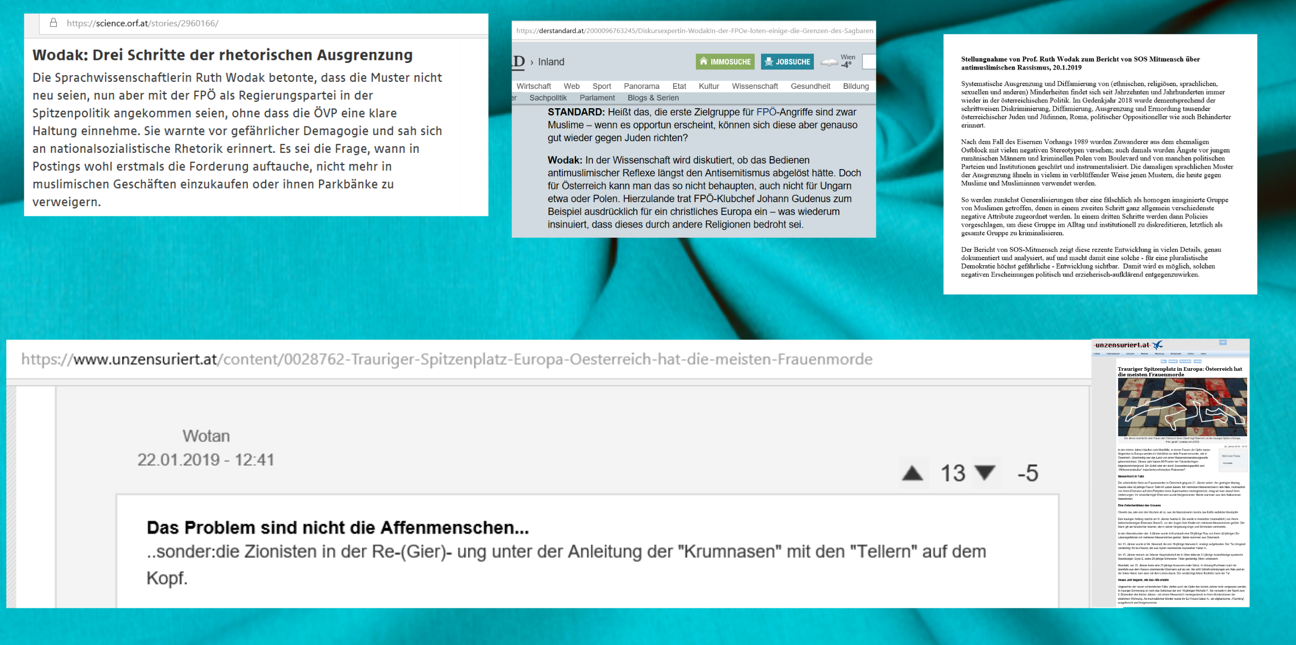 „Die Sprachwissenschaftlerin Ruth Wodak betonte, dass die Muster nicht neu seien, nun aber mit der FPÖ als Regierungspartei in der Spitzenpolitik angekommen seien, ohne dass die ÖVP eine klare Haltung einnehme. Sie warnte vor gefährlicher Demagogie und sah sich an nationalsozialistische Rhetorik erinnert. Es sei die Frage, wann in Postings wohl erstmals die Forderung auftauche, nicht mehr in muslimischen Geschäften einzukaufen oder ihnen Parkbänke zu verweigern.“