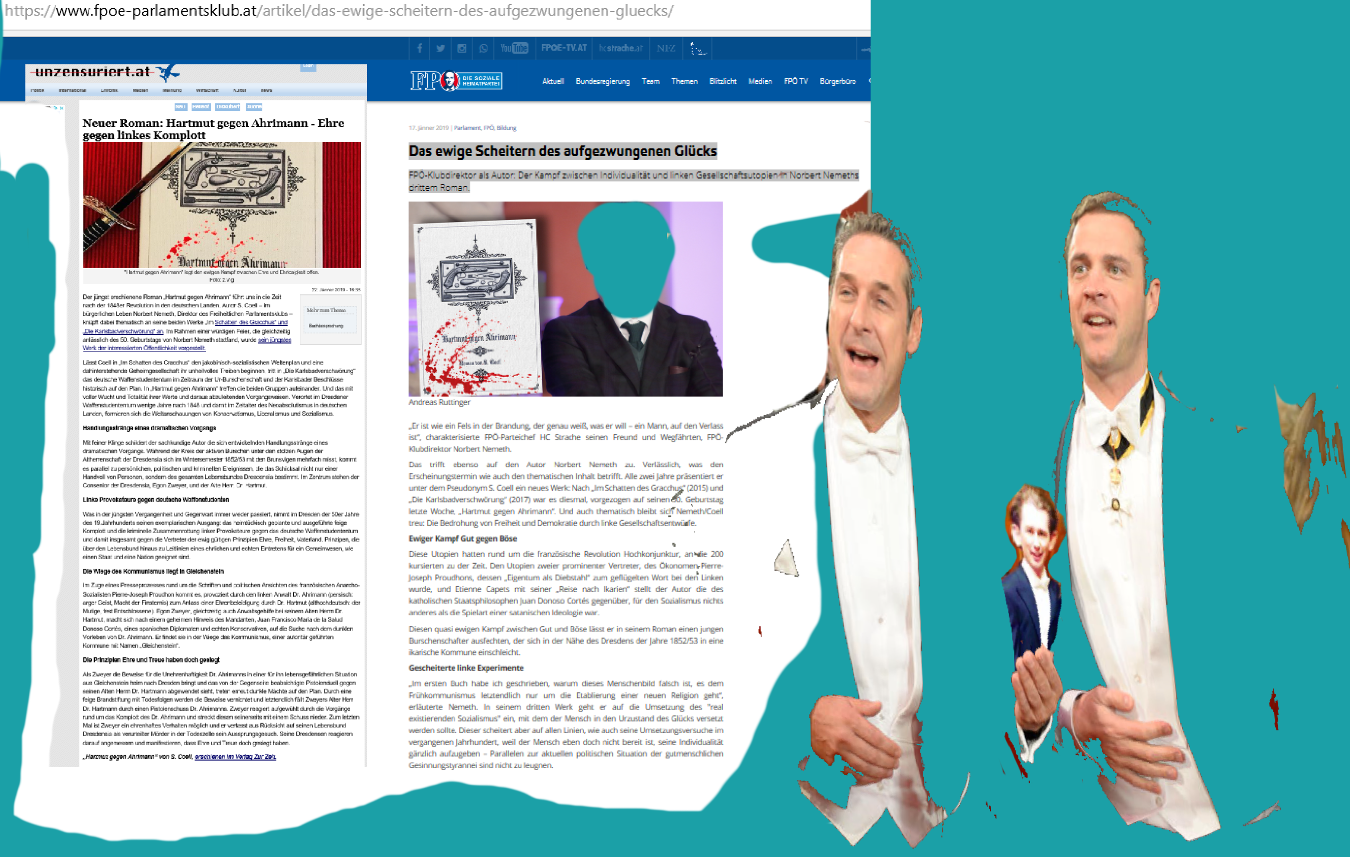 „Das ewige Scheitern des aufgezwungenen Glücks […] FPÖ-Klubdirektor als Autor: Der Kampf zwischen Individualität und linken Gesellschaftsutopien in Norbert Nemeths drittem Roman. ‚Er ist wie ein Fels in der Brandung, der genau weiß, was er will – ein Mann, auf den Verlass ist‘, charakterisierte FPÖ-Parteichef HC Strache seinen Freund und Wegfährten, FPÖ-Klubdirektor Norbert Nemeth. Das trifft ebenso auf den Autor Norbert Nemeth zu.Verlässlich, was den Erscheinungstermin wie auch den thematischen Inhalt betrifft. Alle zwei Jahre präsentiert er unter dem Pseudonym S. Coell ein neues Werk: Nach ‚Im Schatten des Gracchus‘ (2015) und ‚Die Karlsbadverschwörung‘ (2017) war es diesmal, vorgezogen auf seinen 50. Geburtstag letzte Woche, „Hartmut gegen Ahrimann“. Und auch thematisch bleibt sich Nemeth/Coell treu: Die Bedrohung von Freiheit und Demokratie durch linke Gesellschaftsentwürfe.