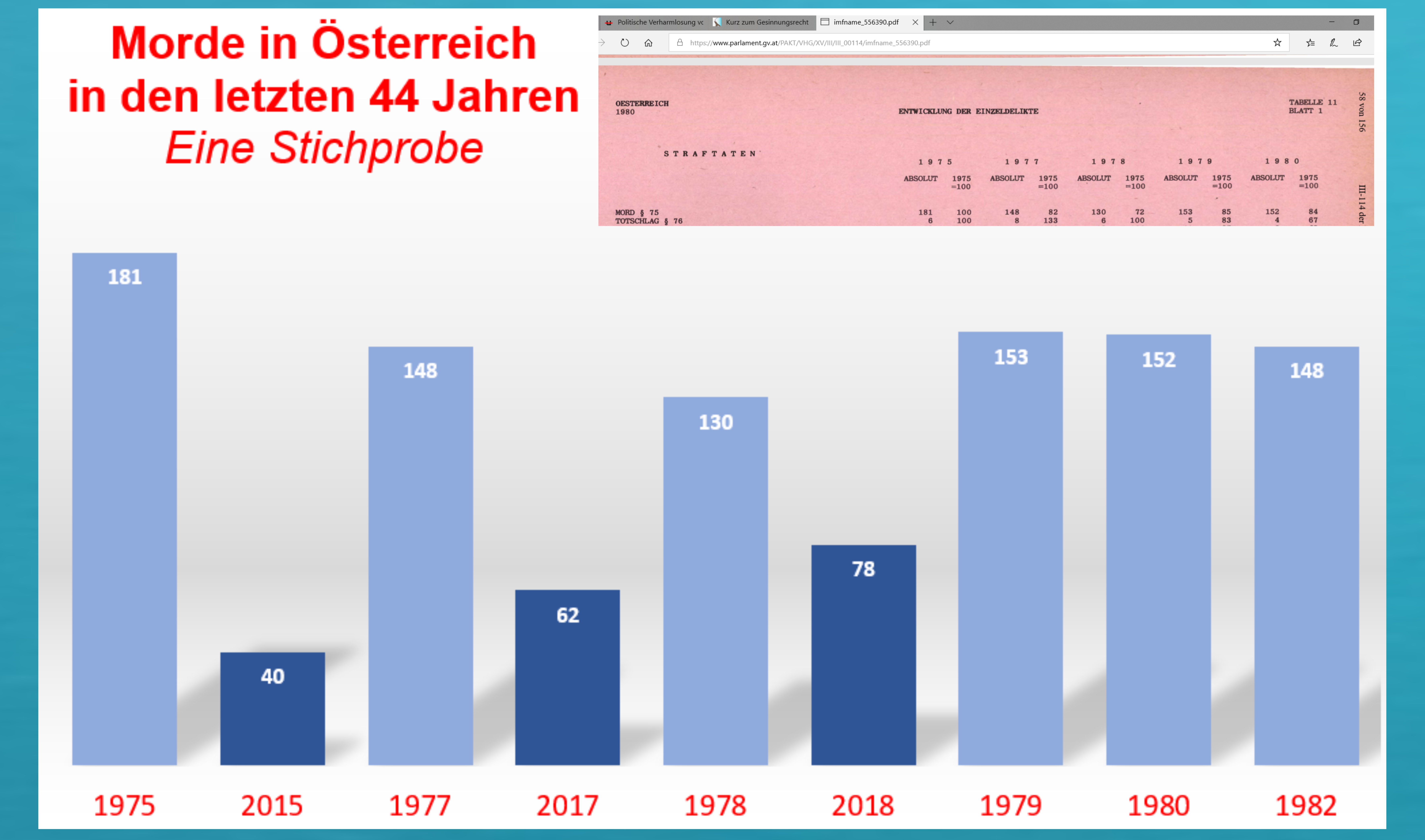 Statt darauf zu verweisen, in welch einer glücklichen Lage sich Österreich befindet, was für eine glückliche Entwicklung Österreich genommen hat, um einen Zeitraum beispielhaft herauszunehmen, in den letzten vierundvierzig Jahren, was die Tötungsdelikte anbelangt, wird gekreischt und mit allen Fingern gefuchtelt gegen die, nein, nicht gegen die vorwiegend männlichen Täter und wenigen weiblichen Täterinnen, sondern gegen das Fremde …