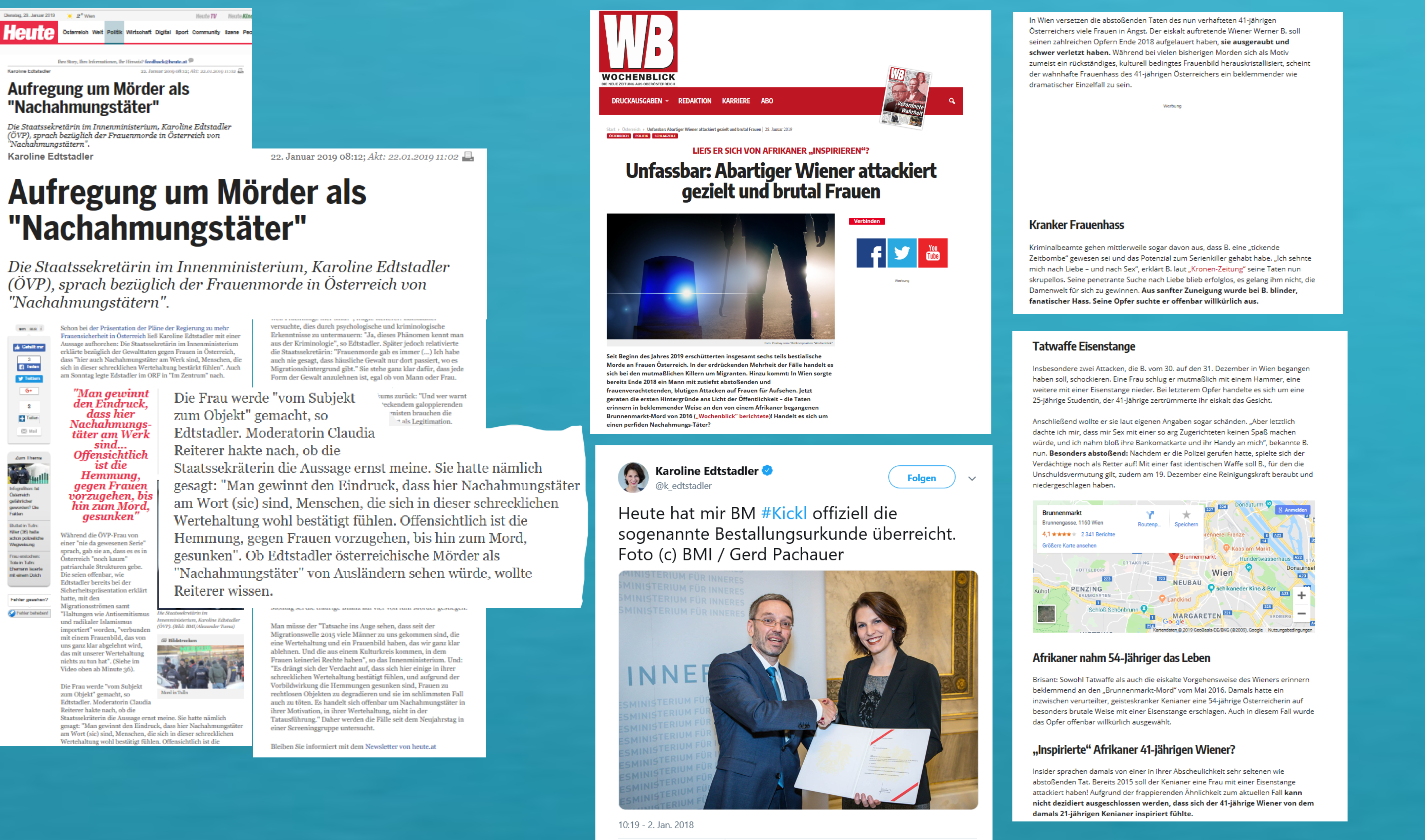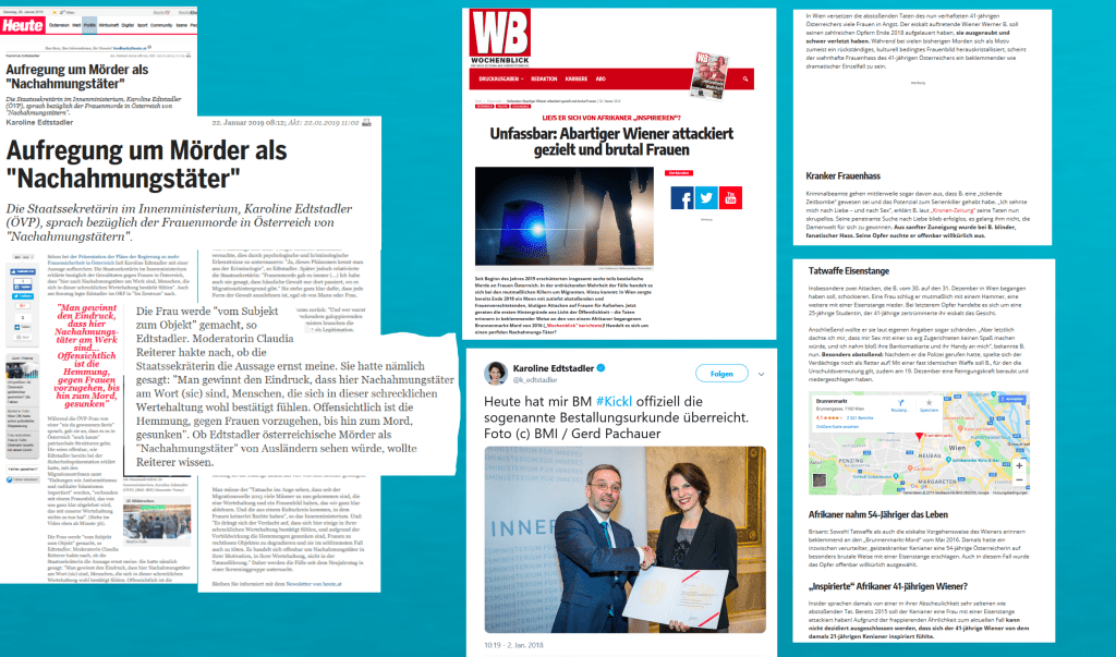 NS Die Nachschreibe des Wochenblicks ist nicht einmal eine Spekulation zu nennen, sondern tatsächlich nur „gezielt und brutal“. Allein die Biographie dieses Mannes widerspricht seiner Nachschreibe. Dieser Mann mußte bei seinen Streifzügen durch Wien nicht erst irgendwo eine ein paar Jahre alte Tageszeitung mit einem Bericht über den Brunnenmarkt finden, um dann etwas nachzuahmen. Allein seine Biographie erzählt von keiner Nachahmung, aber viel von der Verankerung, vom Gefangensein im traditionellen österreichischen Rollenbild, das der Mann nach wie vor …. Dieser Mann beging kein Verbrechen auf dem Brunnenmarkt, aber Wochenblick veröffentlicht zur Bekräftigung seiner Nachschreibe dazu einen Stadtplanausschnitt vom Brunnenmarkt, damit den Lesenden ja nur der Brunnenmarkt in Erinnerung bleibt, wo ein Mann aus …