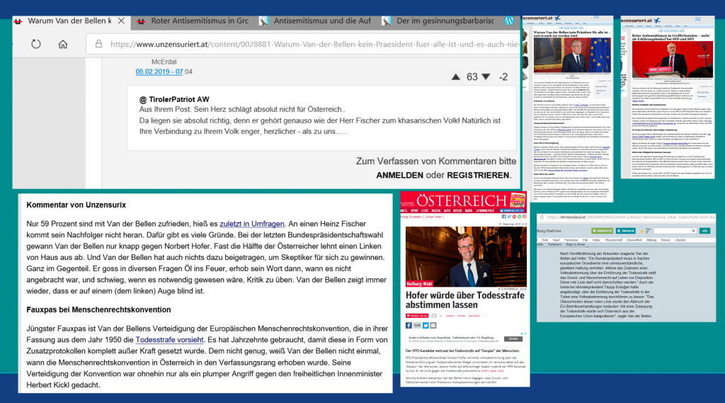 „Jüngster Fauxpas ist Van der Bellens Verteidigung der Europäischen Menschenrechtskonvention, die in ihrer Fassung aus dem Jahr 1950 die Todesstrafe vorsieht. Es hat Jahrzehnte gebraucht, damit diese in Form von Zusatzprotokollen komplett außer Kraft gesetzt wurde. Dem nicht genug, weiß Van der Bellen nicht einmal, wann die Menschenrechtskonvention in Österreich in den Verfassungsrang erhoben wurde. Seine Verteidigung der Konvention war ohnehin nur als ein plumper Angriff gegen den freiheitlichen Innenminister Herbert Kickl gedacht.“