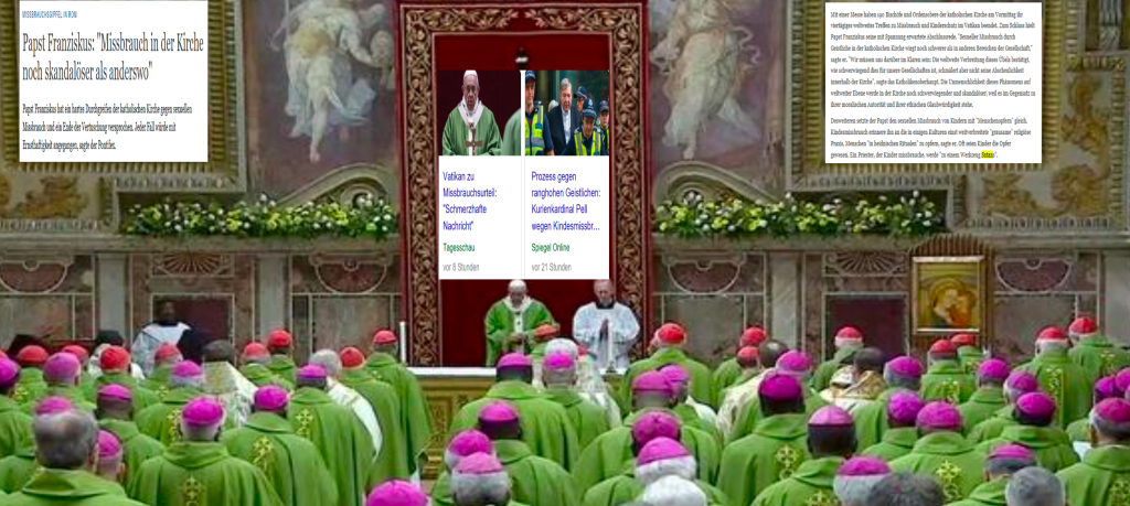 Wo waren diese Männer in all den Jahrzehnten? Was taten diese Spitzen in all den Jahrzehnten mit ihrer Macht als höchste leitende Angestellte? Und vor allem deren stets mit höchster weißer Kappe bedeckte Spitze unter ihnen? Auch diese seit Jahrzehnten eine leitende und nun seit über einem halben Jahrzehnt die höchste kirchenhinausragende Spitze …