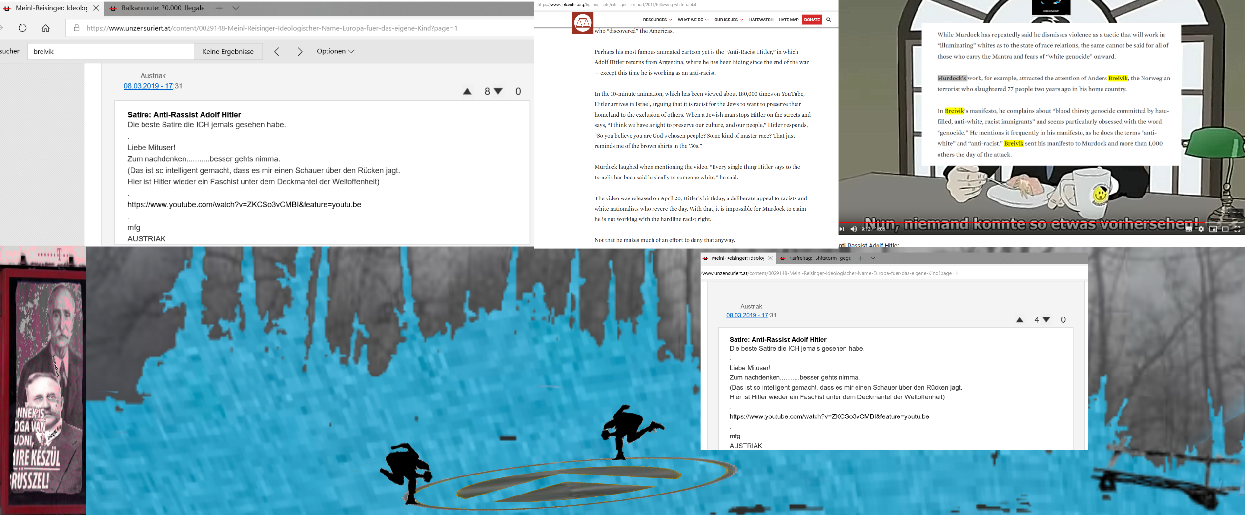 Die Arbeit von Timothy Gallaher Murdock genießt nicht nur die Bewunderung von Austriak. Ein Mann, der in Norwegen 77 Menschen ermordete, war lange vor Austriak von horus the avenger dermaßen beeindruckt, daß er ihm sein Manifest zusandte. Ein Mann und Mörder, der selber kein Satiriker ist, aber einer dem auch Satire Antrieb … vielleicht auch einer, der sich jetzt noch fragt, warum er im Gefängnis – für „nichts“ … einer, der auch in Österreich seine … es muß nicht ausgeführt werden, in welchen Gesinnungskreisen auch er seine …