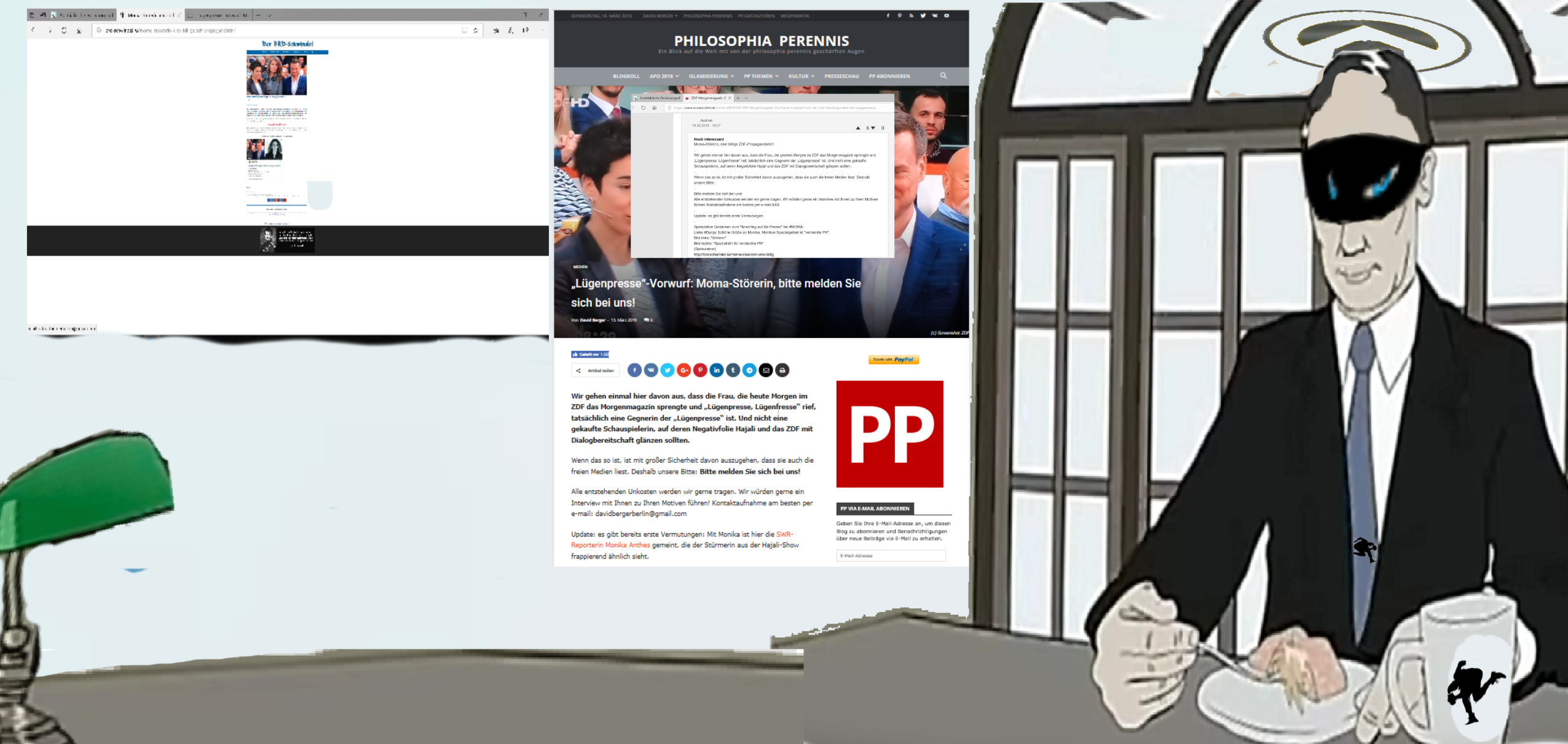 Wir gehen einmal hier davon aus, dass die Frau, die gestern Morgen im ZDF das Morgenmagazin sprengte und „Lügenpresse, Lügenfresse“ rief, tatsächlich eine Gegnerin der „Lügenpresse“ ist. Und nicht eine gekaufte Schauspielerin, auf deren Negativfolie Hajali und das ZDF mit Dialogbereitschaft glänzen sollten.