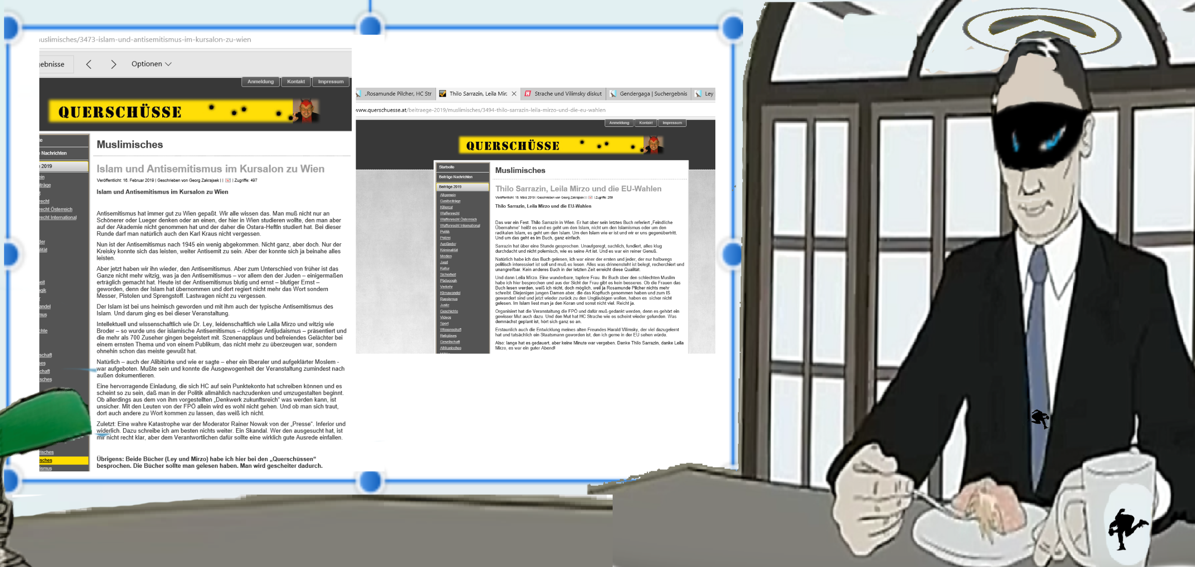 „Intellektuell und wissenschaftlich wie Dr. Ley, leidenschaftlich wie Laila Mirzo und witzig wie Broder – so wurde uns der islamische Antisemitismus – richtiger Antijudaismus – präsentiert und die mehr als 700 Zuseher gingen begeistert mit. Szenenapplaus und befreiendes Gelächter bei einem ernsten Thema und von einem Publikum, das nicht mehr zu überzeugen war, sondern ohnehin schon das meiste gewußt hat. Natürlich – auch der Alibitürke und wie er sagte – eher ein liberaler und aufgeklärter Moslem – war aufgeboten. Mußte sein und konnte die Ausgewogenheit der Veranstaltung zumindest nach außen dokumentieren. Eine hervorragende Einladung, die sich HC auf sein Punktekonto hat schreiben können und es scheint so zu sein, daß man in der Politik allmählich nachzudenken und umzugestalten beginnt. Ob allerdings aus dem von ihm vorgestellten ‚Denkwerk zukunftsreich‘ was werden kann, ist unsicher. Mit den Leuten von der FPÖ allein wird es wohl nicht gehen. Und ob man sich traut, dort auch andere zu Wort kommen zu lassen, das weiß ich nicht. Zuletzt: Eine wahre Katastrophe war der Moderator Rainer Nowak von der ‚Presse‘. Inferior und widerlich. Dazu schreibe ich am besten nichts weiter. Ein Skandal. Wer den ausgesucht hat, ist mir nicht recht klar, aber dem Verantwortlichen dafür sollte eine wirklich gute Ausrede einfallen. Übrigens: Beide Bücher (Ley und Mirzo) habe ich hier bei den ‚Querschüssen‘ besprochen. Die Bücher sollte man gelesen haben. Man wird gescheiter dadurch.“
