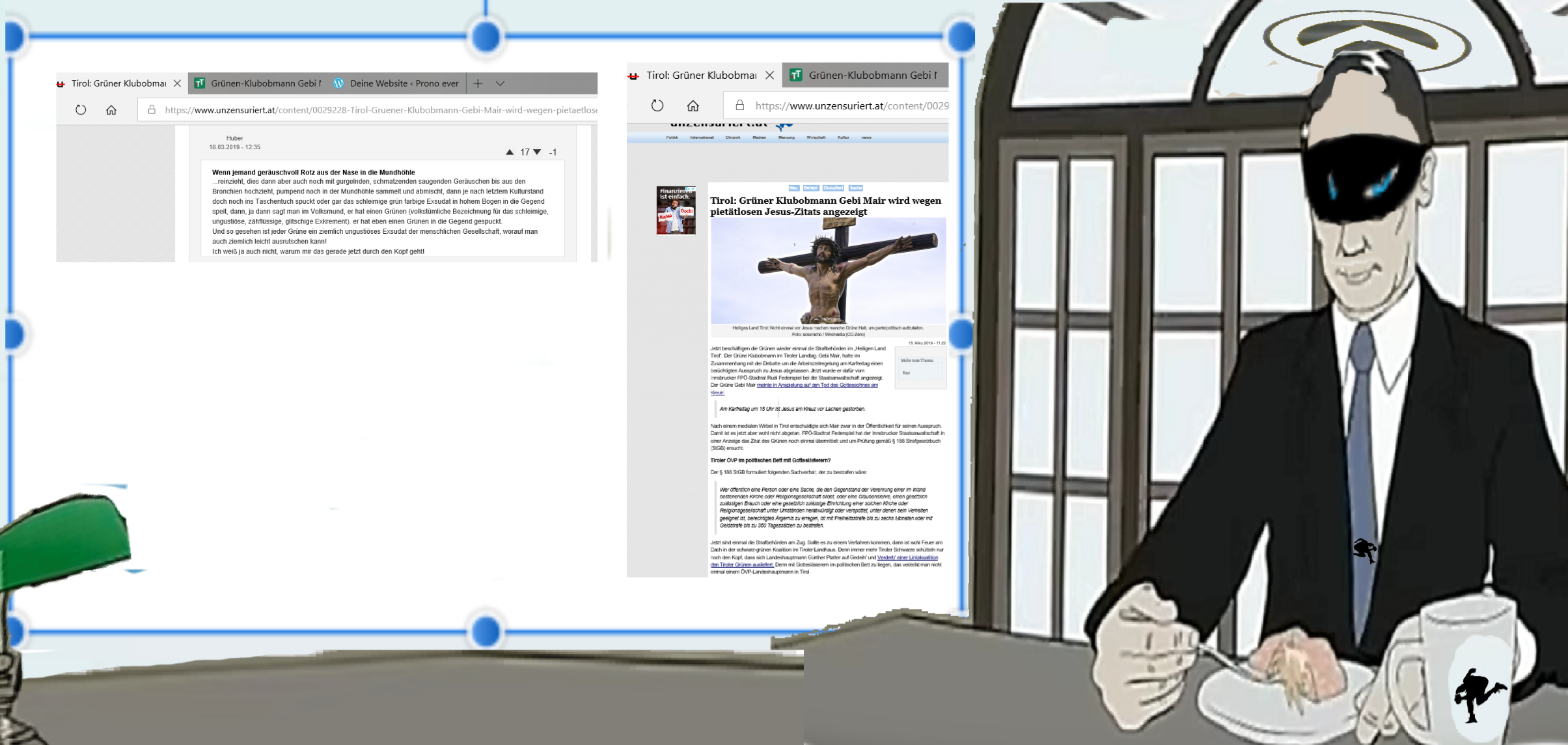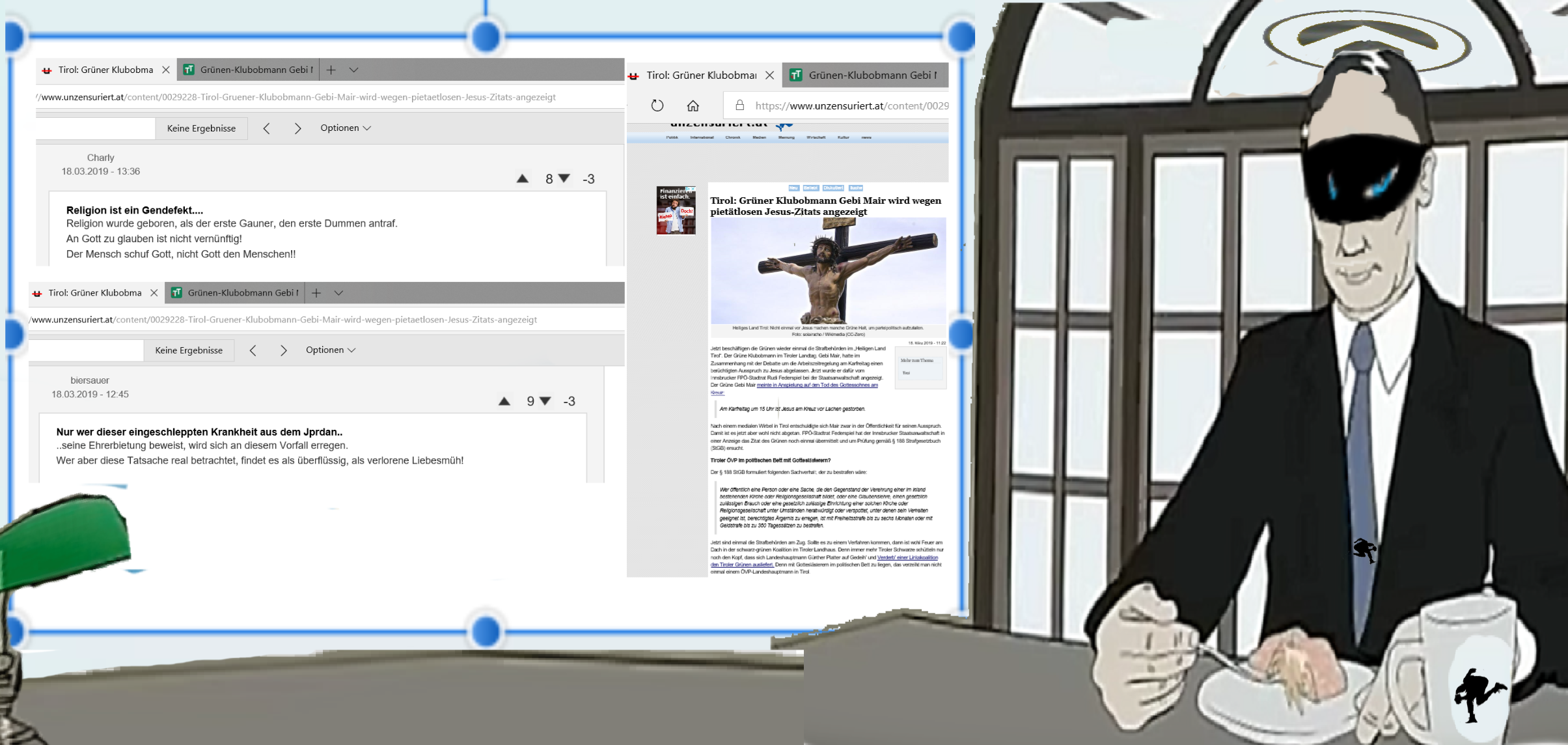 Darüber hinaus gibt es, muß zugegeben werden, noch eine als unlösbar eingestufte Aufgabe, die davon abhält, die Anzeige selbst einzubringen. Wie können jene ebenfalls zur Anzeige gebracht werden, die diesen Kommentaren gegen den Herrn … auf Herrn Federspiel ruht alle Hoffnung und Zuversicht, daß er darauf die rechte Antwort, die rechte Anzeige zu formulieren weiß.