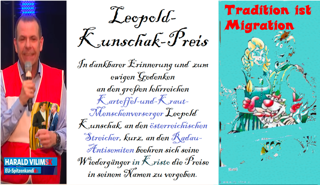 Tradition ist Migration, beispielhaft gelebt von dieser ehrenreichen Familie der Landwirte, der Bücher und Postkarten … Wie viele Generationen dieser Familie leben bereits nach diesem schönen Grundsatz, Tradition ist Migration? Das wurde nicht gezählt. Vielleicht schreibt eines Tages der Biograph des zurzeitigen Vizekanzlers die Chronik dieser Familie. Dann wird er vielleicht auch die Generationen zählen. Bis dahin wird nur eines gewußt, auch das jetzige Familienoberhaupt reicht die Fahne weiter, an seine Kinder. Oh, glücklich migrationsreiche Familie, gemeinsam auf Demonstrationen zu gehen, wenn es gilt, identitär hinaus auf die Straße, Flagge zu zeigen, Bekenntnis abzulegen …