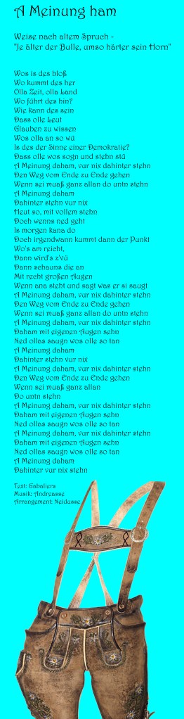 Und, so lärmt er groß, er will „dahinter stehn“ … nur vorne ist nichts, vor allem keine Meinung. Er redet nach, was alle reden, die „die Welt mit eigenen Augen sehn“ von daham … und „ollas glauben wos a poar so red’n … die Ollas sind zum Platzen gefüllt mit diesen hamigen Meinungen und damit sie nicht platzen, müssen aus diesen Ollas die Meinungen ständig von allen abgelassen werden …