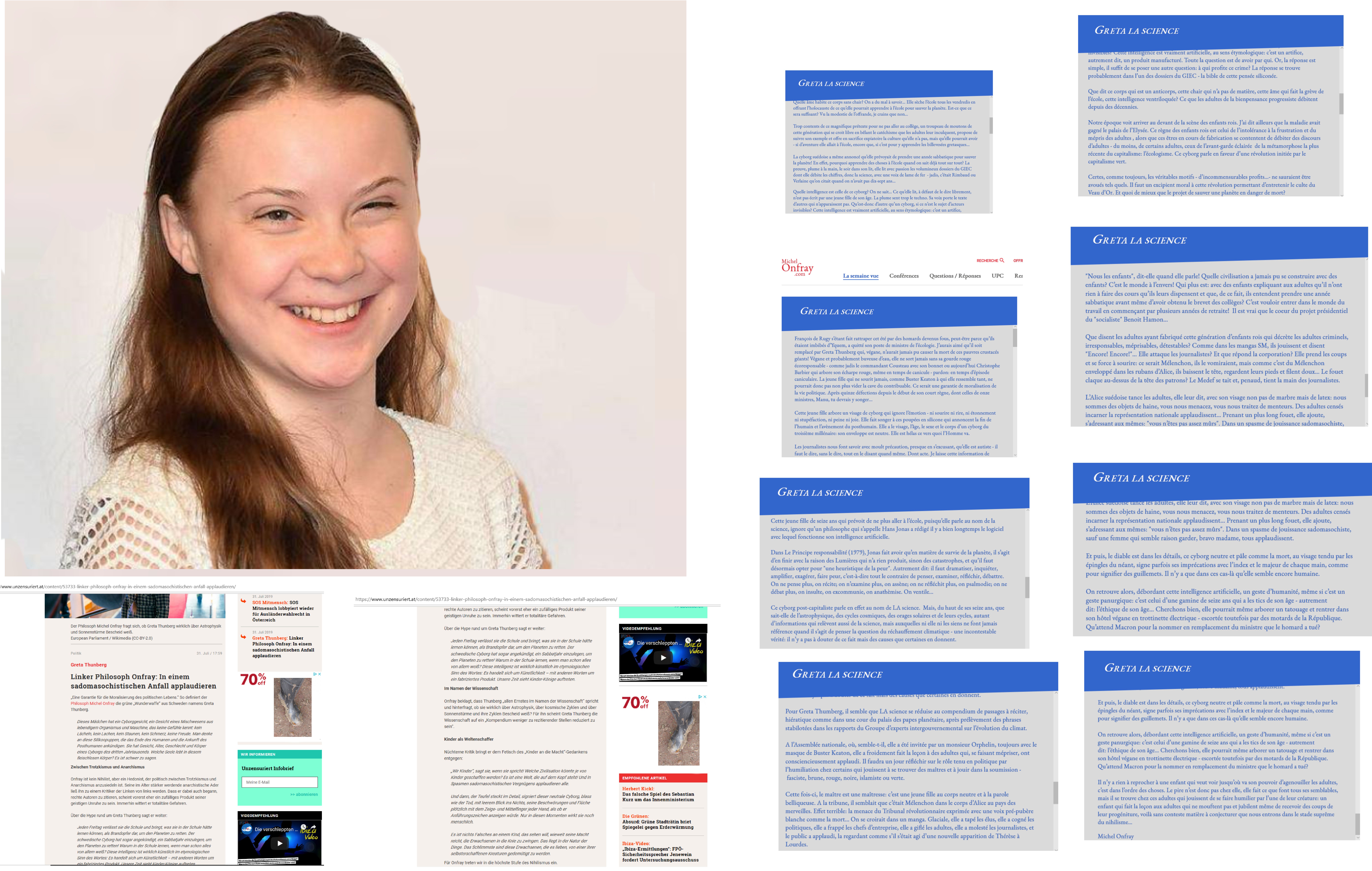 Michel Onfray hat es weit gebracht. Nun genügt bereits ein Bild, um ihn zu widerlegen. Er schreibt, Greta Thunberg, eine, die nie lacht. Wie das Bild in der Collage aber zeigt. Sie kann nicht nur lächeln, Greta Thunberg lacht auch. Wie Maschinen und Macht niemals lachen.