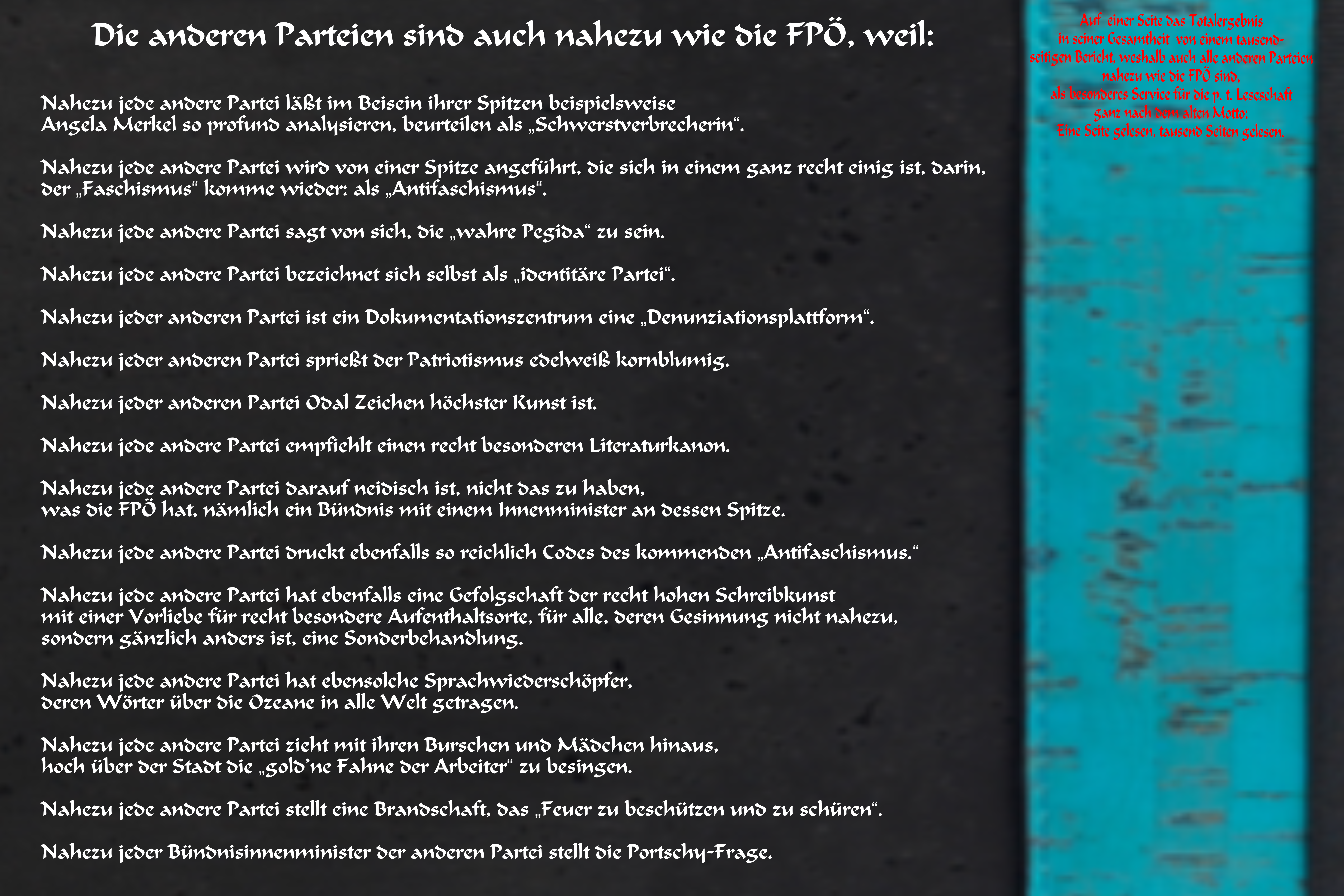 Jede normale Partei hat ebenfalls eine Gefolgschaft der recht hohen Schreibkunst mit einer Vorliebe für recht besondere Aufenthaltsorte, für alle, deren Gesinnung nicht nur normal, sondern gänzlich normal ist, eine Sonderbehandlung.