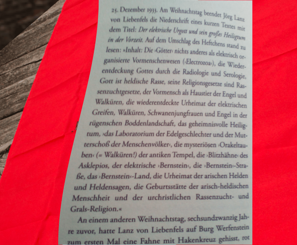 „An einem anderen Weihnachtstag, sechsundzwanzig Jahre zuvor, hatte Lanz von Liebenfels auf Burg Werfenstein zum ersten Mal eine Fahne mit dem Hakenkreuz gehisst […]“