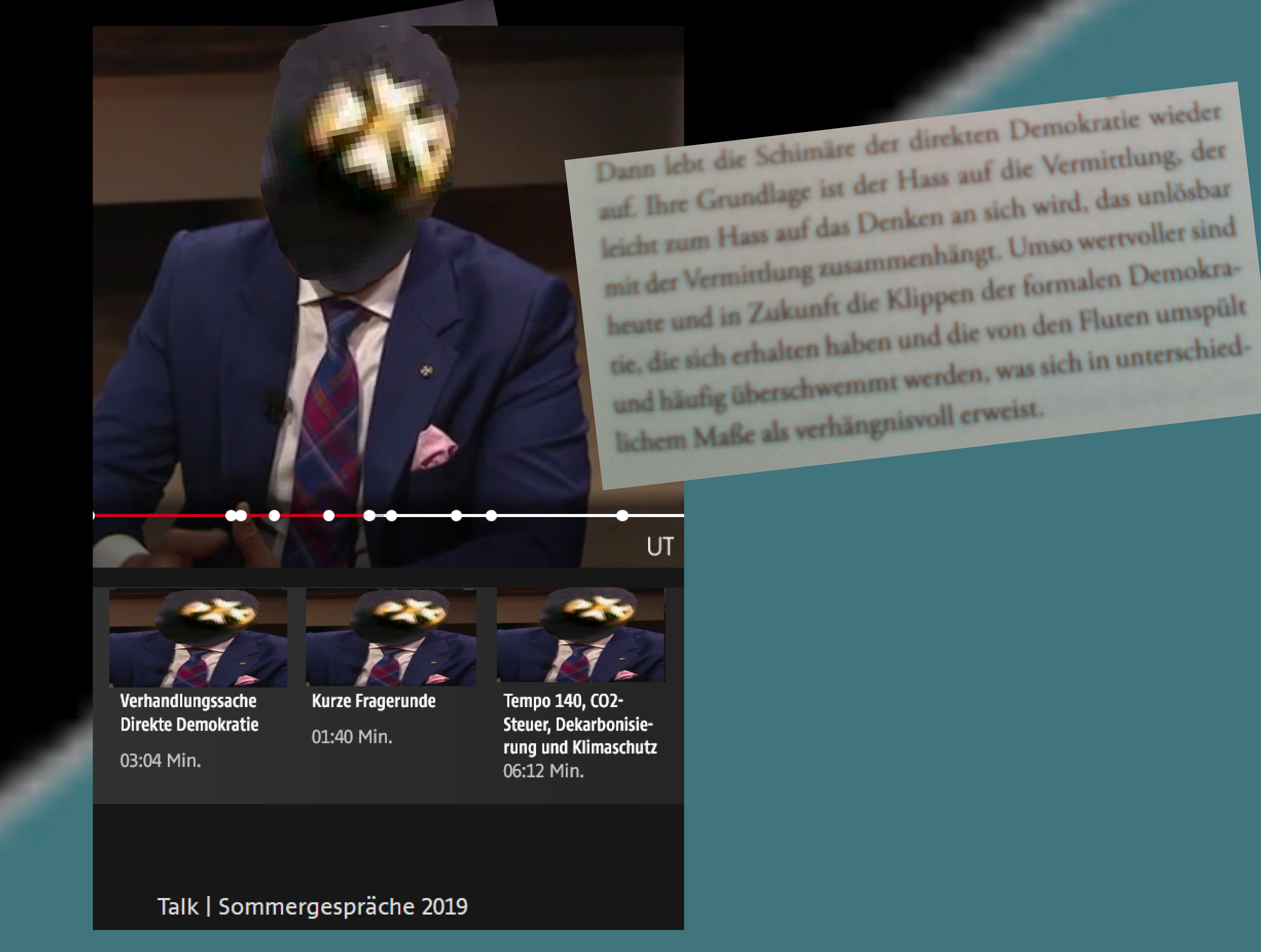 „Dann lebt die Schimäre der direkten Demokratie wieder auf. Ihre Grundlage ist der Hass auf die Vermittlung, der leicht zum Hass auf das Denken an sich wird, das unlösbar mit der Vermittlung zusammenhängt.“