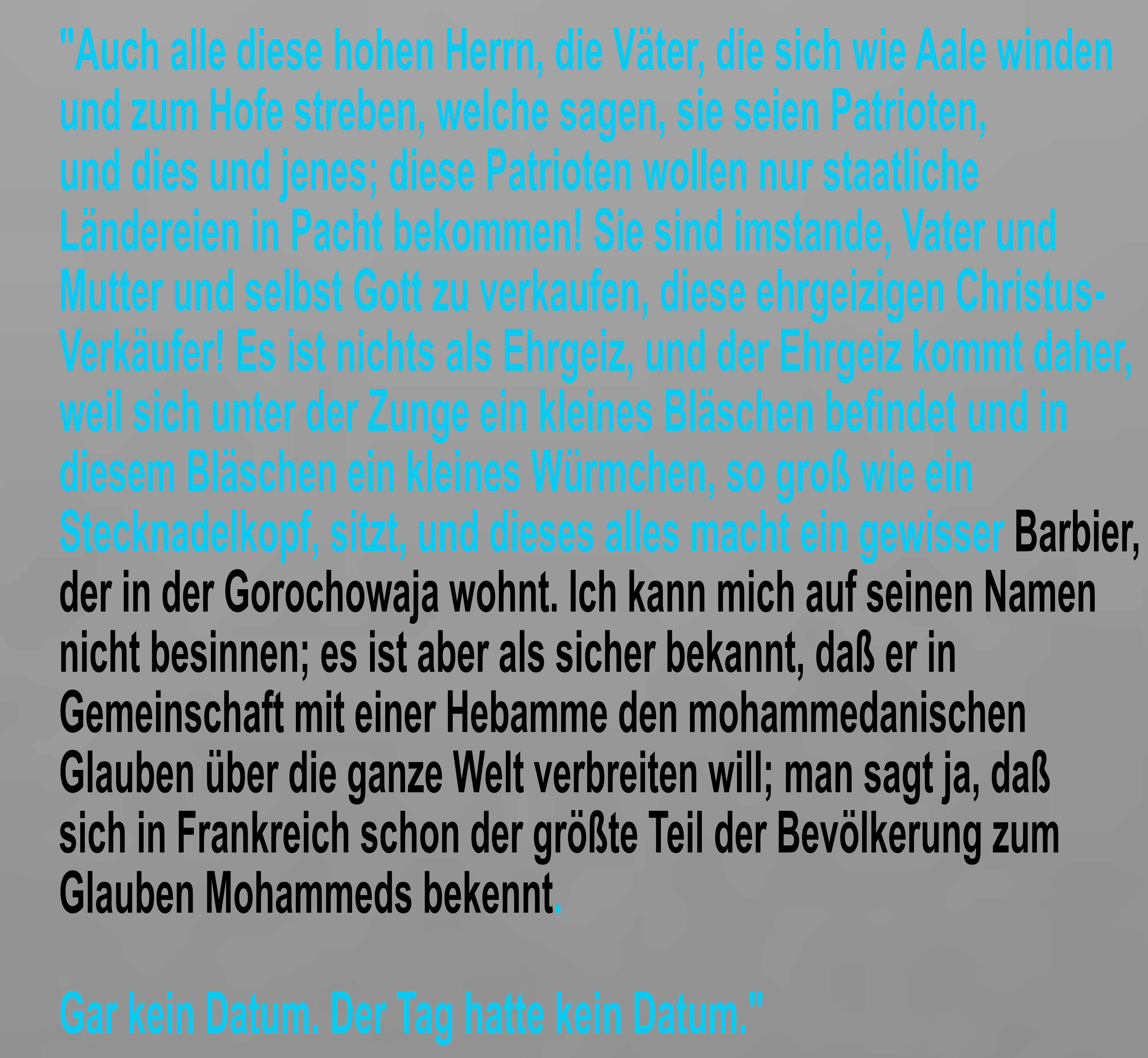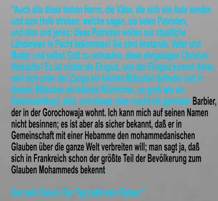„Auch alle diese hohen Herrn, die Väter, die sich wie Aale winden und zum Hofe streben, welche sagen, sie seien Patrioten, und dies und jenes; diese Patrioten wollen nur staatliche Ländereien in Pacht bekommen! Sie sind imstande, Vater und Mutter und selbst Gott zu verkaufen, diese ehrgeizigen Christus-Verkäufer! Es ist nichts als Ehrgeiz, und der Ehrgeiz kommt daher,