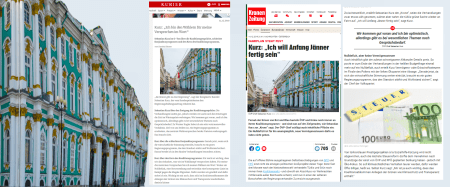 „Nulldefizit, aber keine Vermögenssteuer Auch inhaltlich gibt der zuletzt schweigsame Altkanzler Details preis. So pocht er zum Ende der Verhandlungen in der heiklen Budgetfrage einmal mehr auf ein Nulldefizit, auch erteilt Kurz Vermögens- oder Erbschaftssteuern im Finale des Pokers mit der linken Ökopartei eine Absage. ‚Gerade jetzt, da sich die wirtschaftliche Stimmung weiter eintrübt, braucht es ein gutes Regierungsprogramm, das den Standort stärkt und Wohlstand sichert‘, sagt der Chef der Volkspartei.“