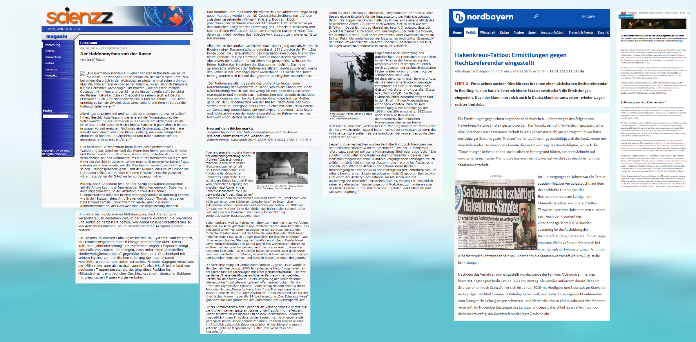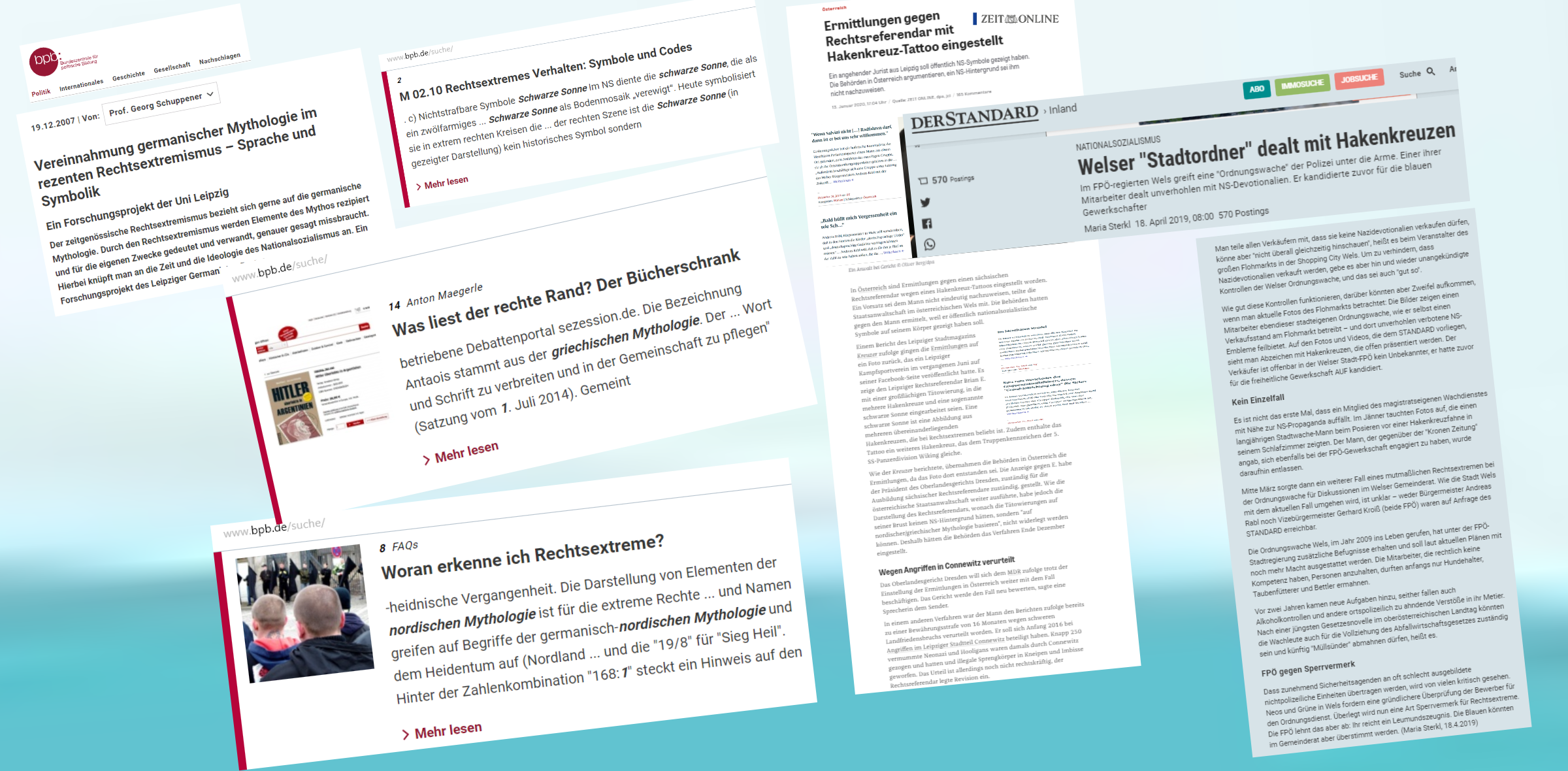 „Die Ermittlungen gegen einen angehenden sächsischen Juristen wegen des Zeigens von Hakenkreuz-Tattoos sind eingestellt worden. Der Vorsatz sei nicht ‚erweislich‘ gewesen, teilte eine Sprecherin der Staatsanwaltschaft in Wels (Oberösterreich) am Montag mit. „Insbesondere konnte die Verantwortung des Beschuldigten, wonach die Tätowierungen keinen nationalsozialistischen Hintergrund hätten, sondern vielmehr auf nordischer/griechischer Mythologie basieren, nicht widerlegt werden“, so die Sprecherin der Staatsanwaltschaft.“