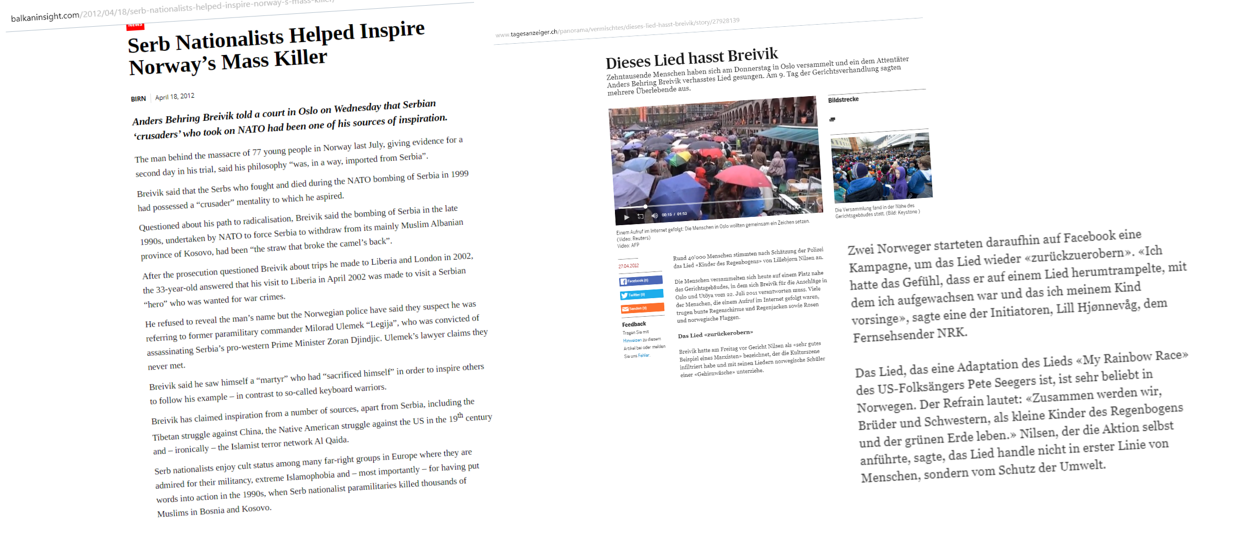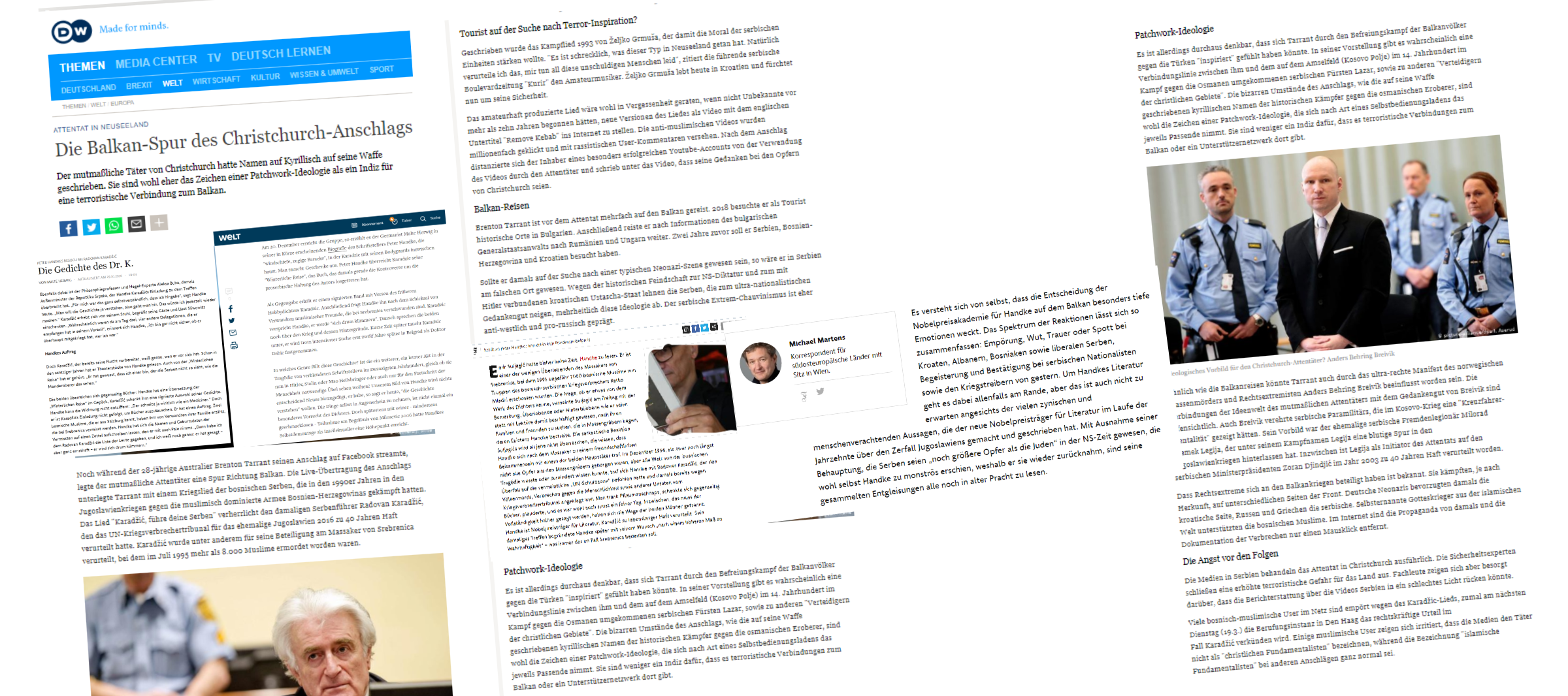 „Noch während der 28-jährige […] seinen Anschlag auf Facebook streamte, legte der mutmaßliche Attentäter eine Spur Richtung Balkan. Die Live-Übertragung des Anschlags unterlegte T[.] mit einem Kriegslied der bosnischen Serben, die in den 1990er Jahren in den Jugoslawienkriegen gegen die muslimisch dominierte Armee Bosnien-Herzegowinas gekämpft hatten. Das Lied ‚Karadžić, führe deine Serben‘ verherrlicht den damaligen Serbenführer Radovan Karadžić, den das UN-Kriegsverbrechertribunal für das ehemalige Jugoslawien 2016 zu 40 Jahren Haft verurteilt hatte. Karadžić wurde unter anderem für seine Beteiligung am Massaker von Srebrenica verurteilt, bei dem im Juli 1995 mehr als 8.000 Muslime ermordet worden waren.“