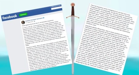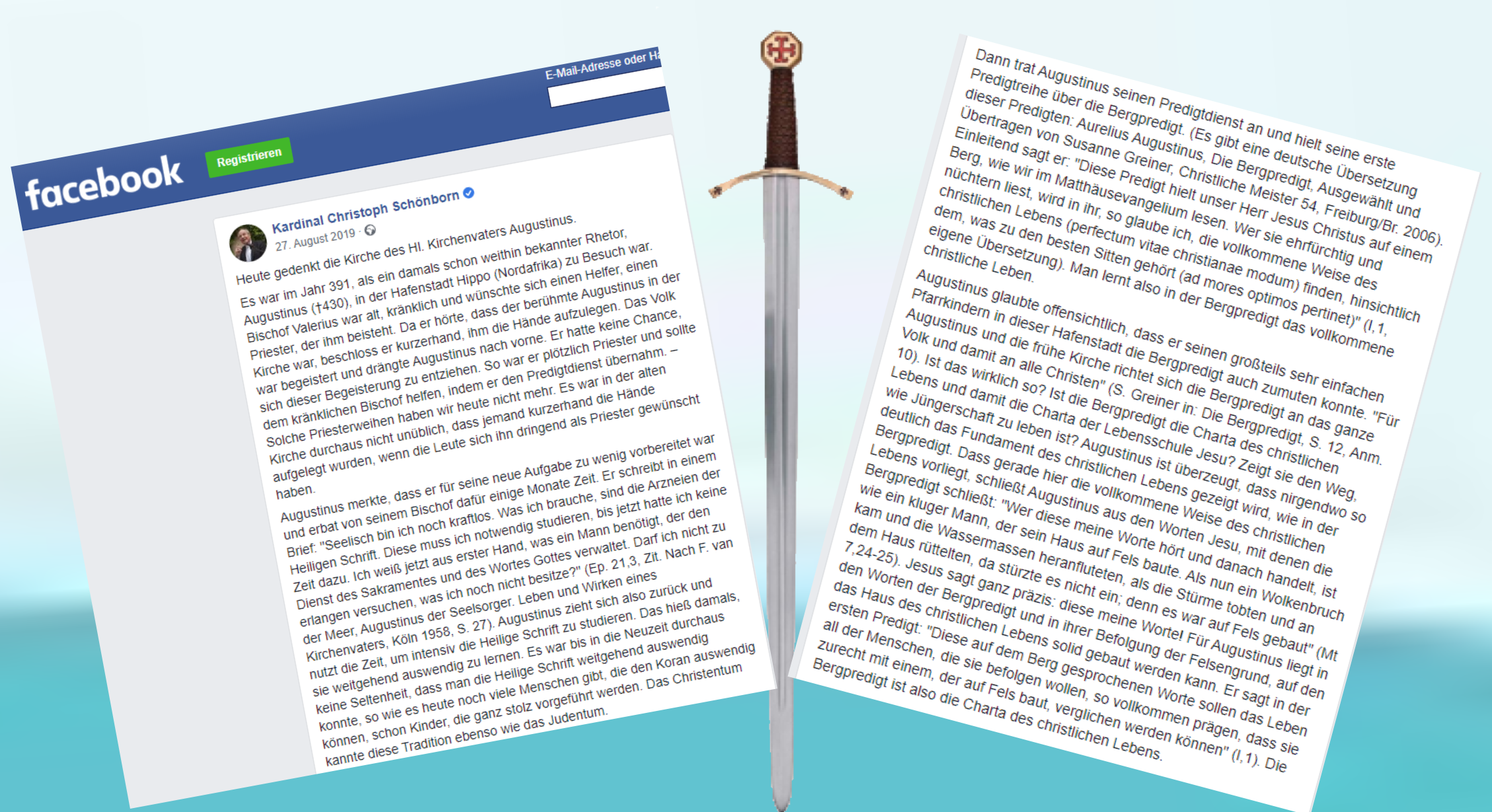 „Heute gedenkt die Kirche des Hl. Kirchenvaters Augustinus. Augustinus schreibt in einem Brief: ‚Seelisch bin ich noch kraftlos. Was ich brauche, sind die Arzneien der Heiligen Schrift. Diese muss ich notwendig studieren, bis jetzt hatte ich keine Zeit dazu. Ich weiß jetzt aus erster Hand, was ein Mann benötigt […] Augustinus […] intensiv die Heilige Schrift zu studieren […] sie weitgehend auswendig […] keine Seltenheit, dass man die Heilige Schrift weitgehend auswendig […] heute noch viele Menschen gibt, die den Koran auswendig können, schon Kinder, die ganz stolz vorgeführt werden.“