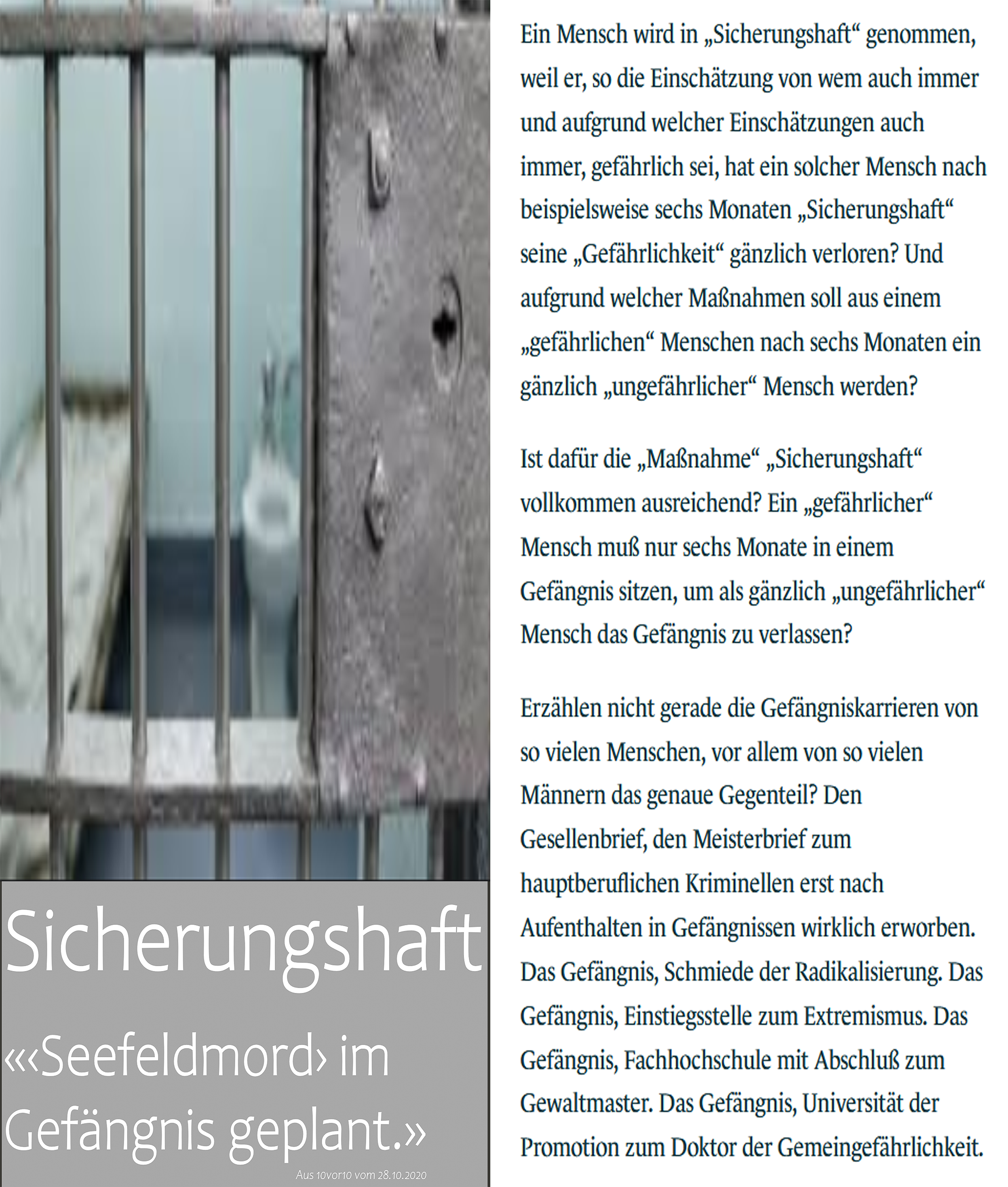 Es muß aber dabei nur noch genau geprüft werden, daß die geschenkte Gefängniszeit zum Planen von Morden auch wirklich ausreichend ist, um einen perfekten Mordplan zu entwerfen, daß also die „Sicherungshaft“ diesen Namen wirklich verdient, die Mordplanenden sicher sein können, die Zusicherung haben, ausreichend Zeit eingeräumt zu bekommen, um das Gefängnis mit einem tatsächlich perfekten Plan zum Morden zu verlassen und niemals wegen ihres Mordens erwischt werden können.