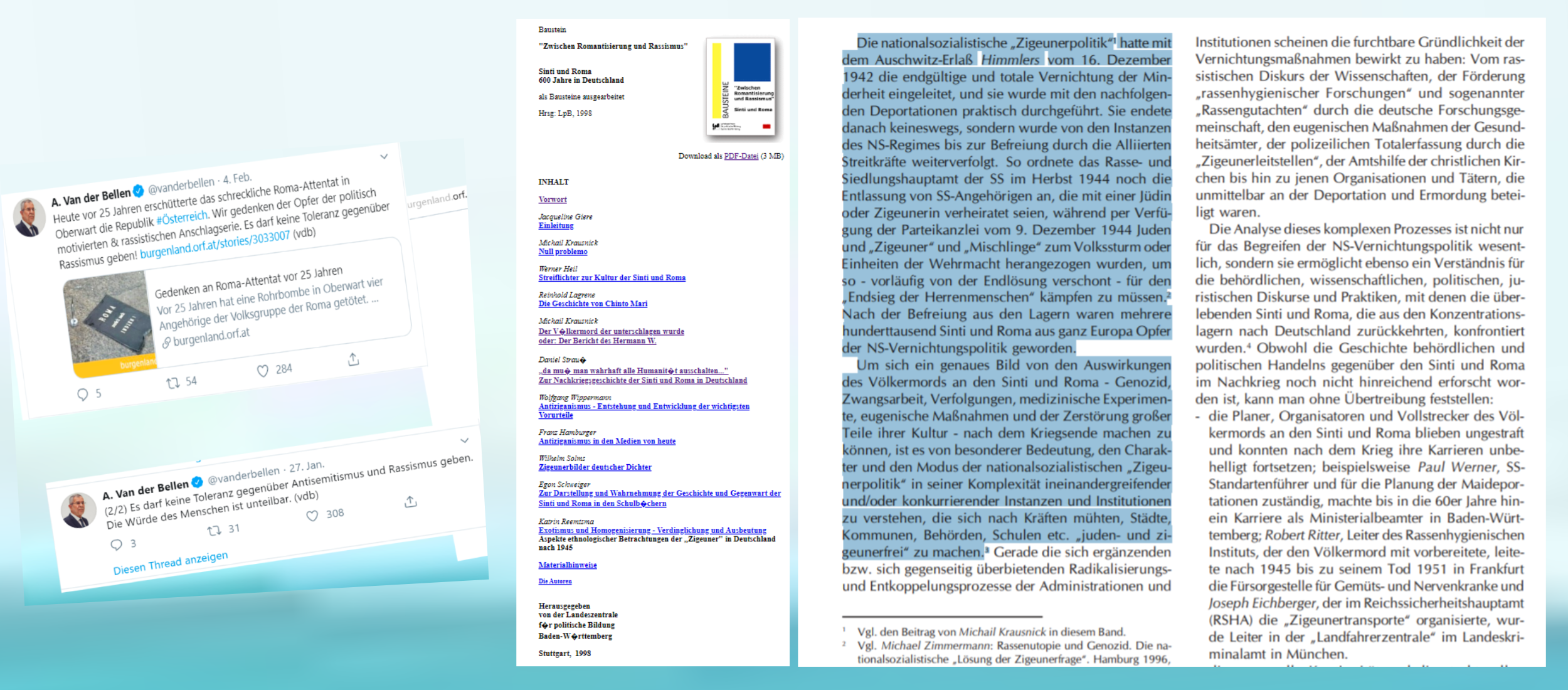 Was in „Sinti und Roma – 600 Jahre in Deutschland“ beschrieben ist, erzählt von Vergangenheit und von der Fortsetzung der Vergangenheit nach 1945, auch von Menschen mit ihren Karrieren vor 1945 und nach 1945 in Deutschland. Zum angesprochenen „Rassenhygienische Institut“ fällt sofort das „Rassenbiologische Institut“ in Innsbruck ein, mit seinen Männern und ihren Karrieren vor 1945 und nach 1945 mit Gesinnungsweitertragung; einer aus diesem Institut soll, ein weiteres Mal, stellvertretend genannt werden, ein Mann in hohen politischen Funktionen, ein Mann, der sich berufen fühlte, Bundespräsident in Österreich …