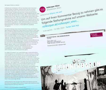 „Um auf Ihren Kommentar Bezug [9. Februar 2020] zu nehmen gibt es folgende Stellungnahme auf unserer Webseite: https://volksoper.at/volksoper_wien/
