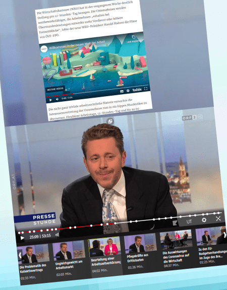 Harald Mahrer unterstellt also der Gewerkschaft in den „70er Jahren“ stehengeblieben zu sein, mit ihren Ansichten. Harald Mahrer und seine nun türkis getupfte schwarze Partei waren schon einmal weiter, mit ihren Ansichten, das war in den 30er Jahren. Und nun ist Harald Mahrer und seine türkis getupfte Partei nicht einmal mehr in den 30er Jahren, sondern stehen ansichtsmäßig Jahre oder gar Jahrzehnte vor den 30er Jahren des letzten Jahrhunderts. Zu Erinnerung, wie sehr setzte sich Harald Mahrer für den 12-Stunden-Tag und die 60-Stunden-Woche im Jahr 18 dieses Jahrhunderts ein, und vollbrachte dabei gleich mit seiner Wirtschaftskammer seine bisher größte Leistung: das Werbevideo zum 12-Stunden-Tag der 60-Stunden-Woche …