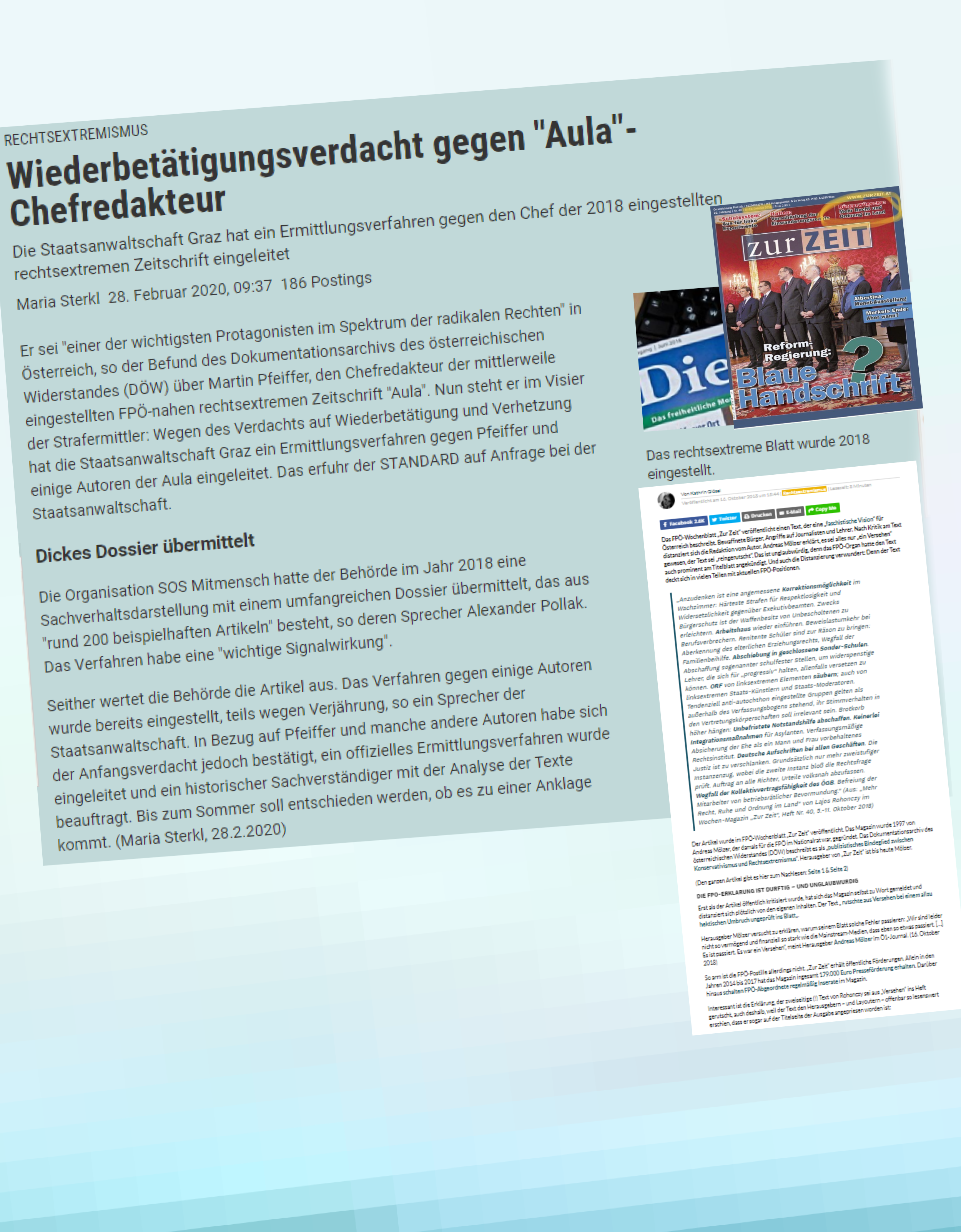 Seit 18 liege der österreichischen Behörde, ist nun im Februar 2020 zu lesen, eine „Sachverhaltsdarstellung mit einem umfangreichen Dossier“ vor, ein „historischer Sachverständiger“ sei mit der Analyse der Texte beauftragt, und bis zum Sommer 2020 solle es eine Entscheidung geben, ob es zu einer Anklage komme oder nicht, zu einer Anklage auch gegen Martin Pfeiffer, gegen den „Aula-Chefredakteur“.