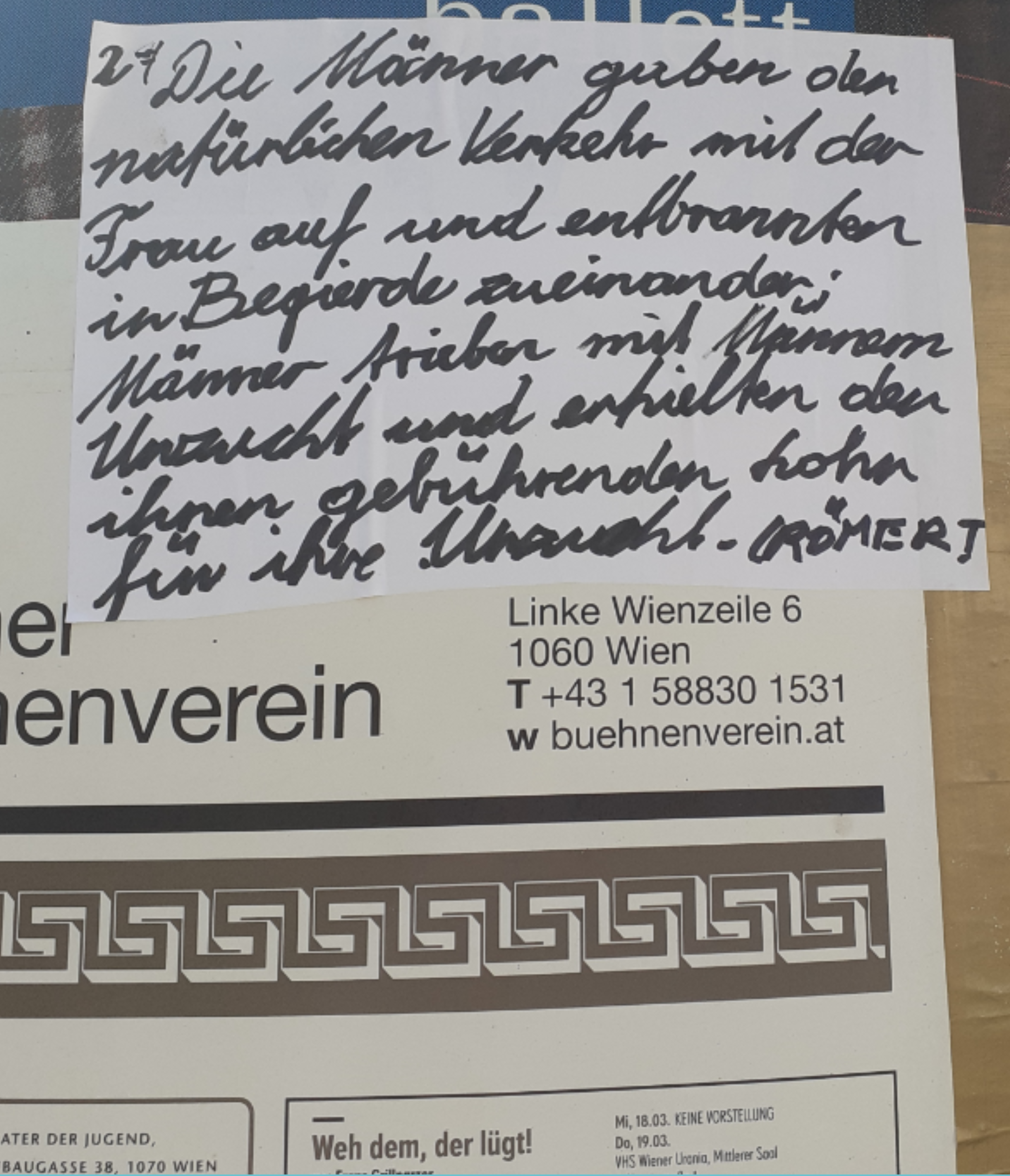 „27 Die Männer gaben den natürlichen Verkehr mit der Frau auf und entbrannten in Begierde zueinander; Männer trieben mit Männern Unzucht und erhielten den ihnen gebührenden Lohn für ihre Unzucht. (Römer)“