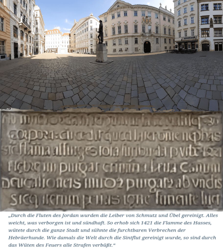 „Seit dem frühen 14. Jahrhundert kam es immer wieder zu lokalen Judenverfolgungen. Besonders schwerwiegend waren jene von 1349, die in einem zeitlichen Zusammenhang mit der Pest standen. Unter dem Vorwand, dass die jüdischen BewohnerInnen Brunnen und Quellen vergiftet und damit die Pest verursacht hätten, um die Christenheit auszulöschen, wurden Juden und Jüdinnen in ganz Österreich verfolgt. In Feldkirch, Krems, Salzburg, Hallein, Zwettl und Braunau lassen sich Morde und Plünderungen nachweisen. Derartige Pogrome wurden in vielen Gemeinden vor dem Auftreten der Pest quasi ‚vorbeugend‘ durchgeführt.“