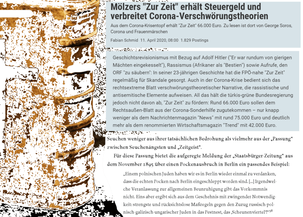 Wie vor 125 Jahren ein „polnischer Jude“ beschuldigt wurde, eine Seuche gebracht zu haben, wird nun ein „ungarischer Jude beschuldigt, eine Seuche zu bringen. Etwa von einem Mann, zu dem etwas zu sagen, die Zeit fehlt, so kurz sind die Stunden der Zeit der Corona geworden. Aber nicht nur der Mann, von dem nicht gewußt wird, ob er im Grätzel Buda oder im Grätzel Pest wohnt, beschuldigt den „ungarischen Juden“, auch ein Magazin, von dem gewußt wird, es hat ihr Lager im Grätzel Landstraße, verbreitet die Beschuldigung des „ungarischen Juden“, belohnt dafür von der österreichischen Bundesregierung der schwarzgrünen Eintracht durch eine außerordentliche Förderung in Zeiten der Corona.