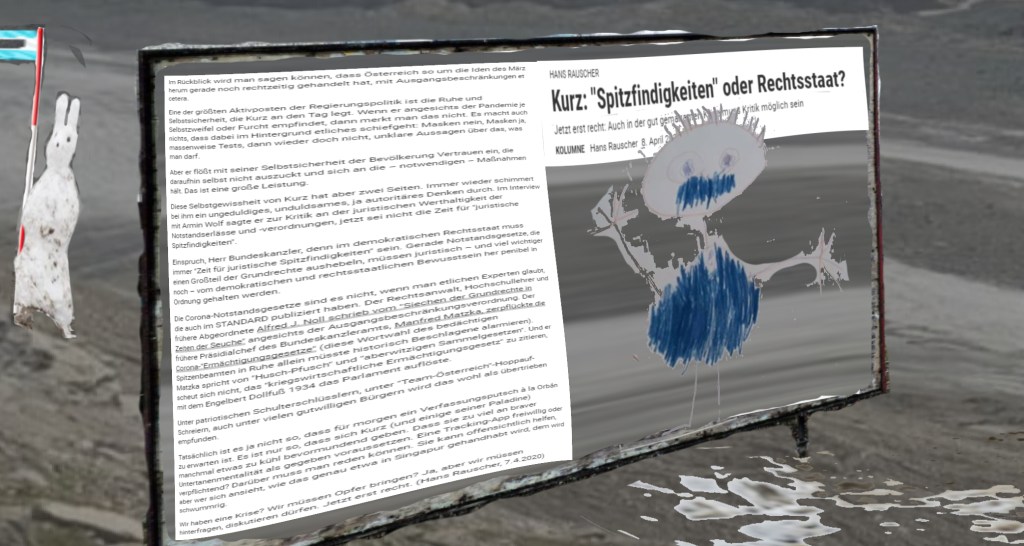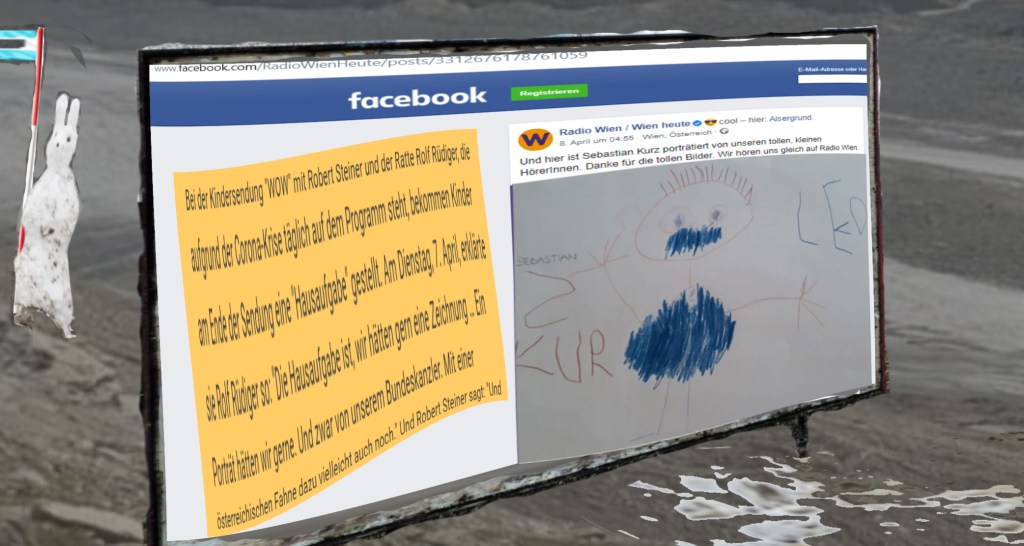 Ein Medium gibt Kindern eine „Hausaufgabe“, nämlich „unseren Bundeskanzler zu zeichnen, mit Fahne“ … Im Frühjahr 2020. Die Nase des Herrn Karl riecht nach wie vor gut und genau, woher der … Und so buddelt das Medium den abgenagten, mehrmals gebrochenen, verdreckten Knochen des Personenkults, und das Medium weiß instinktiv, wem der Personenkult zu gelten hat, im Jahr ’20, in Österreich. Einem, der dafür auch viel tut. Denn. Der Personenkult wird nur jenen zuteil, mit autoritärem Gehabe, mit ihrem Hinwegsetzen von Rechten, das könnte mißverstanden werden, Rechte werden nicht weggesetzt, sondern eingeladen, sich dazu zu setzen, Personenkult wird nur jenen zuteil, die ein sehr eigentümliches Verständnis und vor allem eine sehr eigentümliche Auslegung, mehr noch, ein sehr eigenwilliges und eigentümliches Vorgehen in bezug auf neu zu schaffende Gesetze haben.
