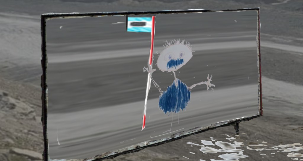 Einem Kind aber ist die „Hausaufgabe“ auf eine Weise gelungen, wie diese wohl nicht beabsichtigt war, von diesem Medium, wenn dieses Medium überhaupt mit einer durchdachten Absicht die „Hausaufgabe“ erteilt hat, außer der Absicht, ihm aufgedrängt durch das mit der Nase des Herrn Karl Errochene, dieses Mannes Wohlwollen sich zu sichern, den forcierten, massiven und aggressiven Personenkult, den es vor 1945 und auch vor 1938 auf dieser Scholle gab, auszubuddeln,einem Kind ist wohl das endgültige Portrait dieses Personenkults gelungen, das Kind zeichnete ihn mit einem blauen Rumpf, mit einem blauen Mund.
