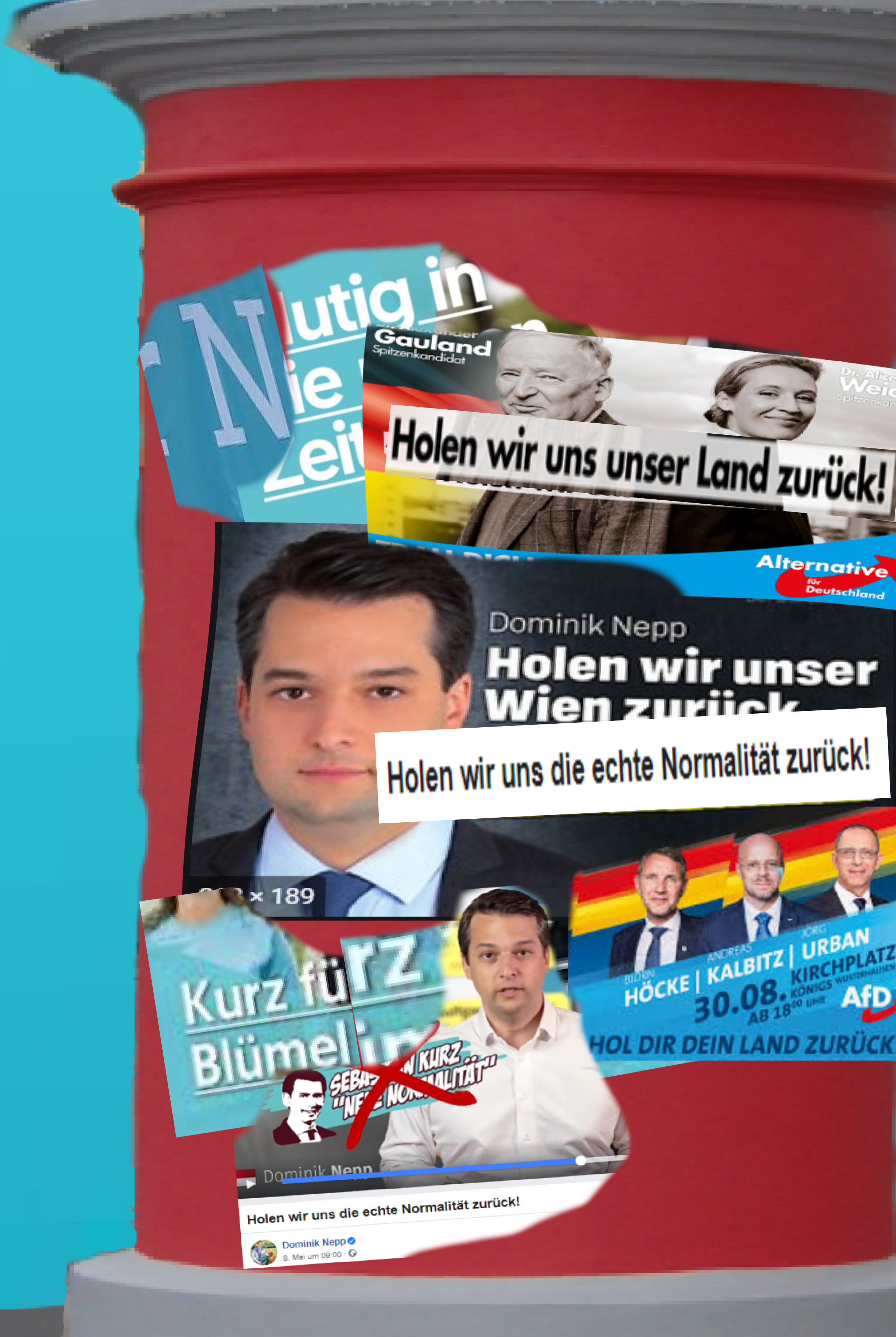 Nur, einfach wie kurz gesagt, er schickt seine Bewerbung an die falsche Stelle. Es gibt für ihn, auch für ihn, aber eine einzige offene Stelle, die zu bekommen, er durchaus hoffen darf. Einen Arbeitsplatz in Thüringen. Dorthin sollte er seine Unterlage zur Bewerbung schicken. Denn dort gibt es auch Männer und Frauen, die von „Holen wir unser Land zurück“ ganz von Sinnen sind, ohne aber zu wissen, von wo „unser Land zurück“ … Wenn einer wie dieser Stellensuchende schon weiß, von wo „unser Wien zurück“ geholt werden könne, so einer wird auch, könnte die ausschlaggebende Überlegung in Thüringen sein, für die Postenbesetzung durch ihn zu stimmen, erst recht ganz bestimmt wissen, von wo „unser Land zurück … Darüber hinaus macht einen wie diesen Bewerber zum ersten Kandidaten für die Postenbesetzung in Thüringen, daß er auch weiß, von wo „die echte Normalität zurück“ …