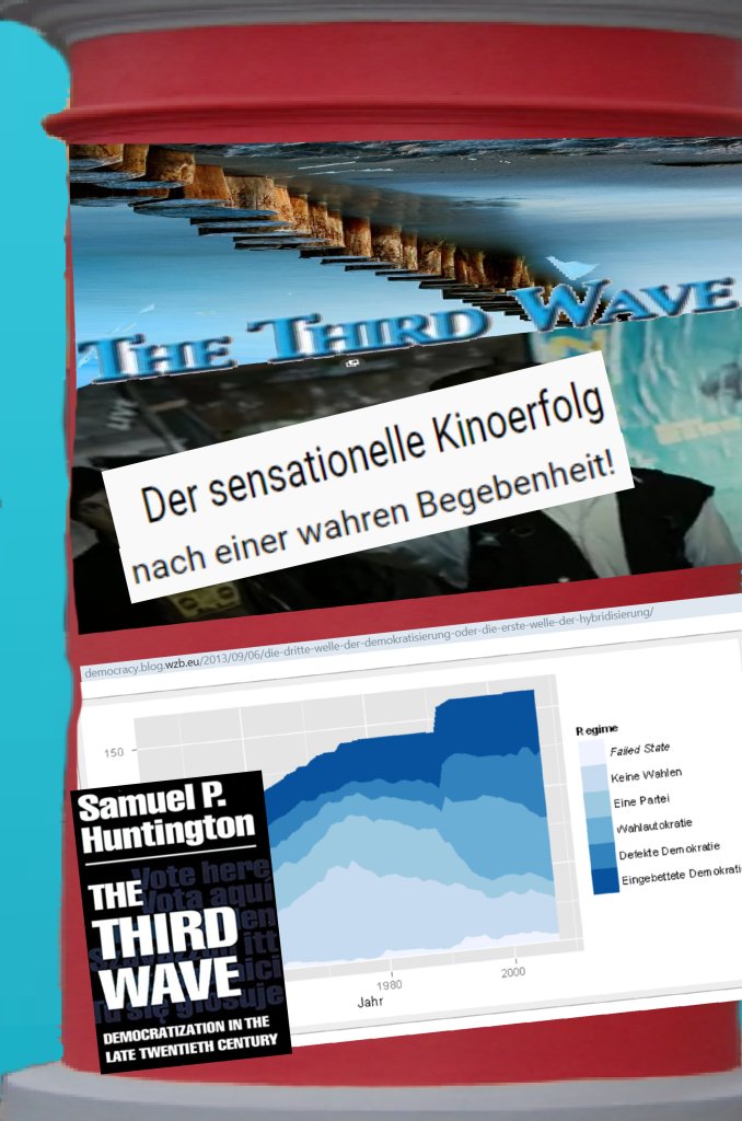 Dann gibt es ein Buch von Samuel P. Huntington, auch mit dem Titel: „The third wave“ – aus ’91. Es geht ihm darin um die Tendenz der Demokratisierung in der Welt. Wenn zurückgeblickt wird auf die Entwicklung seitdem, kann gesagt werden, gerade diesen Titel genommen zu haben, bei der Wahl seines Titels hat er sich nicht geirrt. In Österreich ist Huntington recht bekannt. Bloß. „The third wave“ würde in Österreich nicht Huntington zugeordnet werden, mehr noch, bestritten werden, daß „The third wave“ je ein Buch von ihm ist. Aber alle würden sofort ein Buch von ihm nennen können: „The Clash of Civilizations“, genauer, den deutschen Titel würden alle in der Sekunde herausschreien: „Kampf der Kulturen“ … Das sagt wohl auch viel über das Vorherrschende in Österreich, ein Buch zum angenommenen Trend der Demokratisierung unbekannt, aber ein Buch vom selben Autor zum Zusammenprall, bildlich gesprochen, auf jedem Nachtkästchen, gleich, wörtlich gesprochen, neben der Bibel …