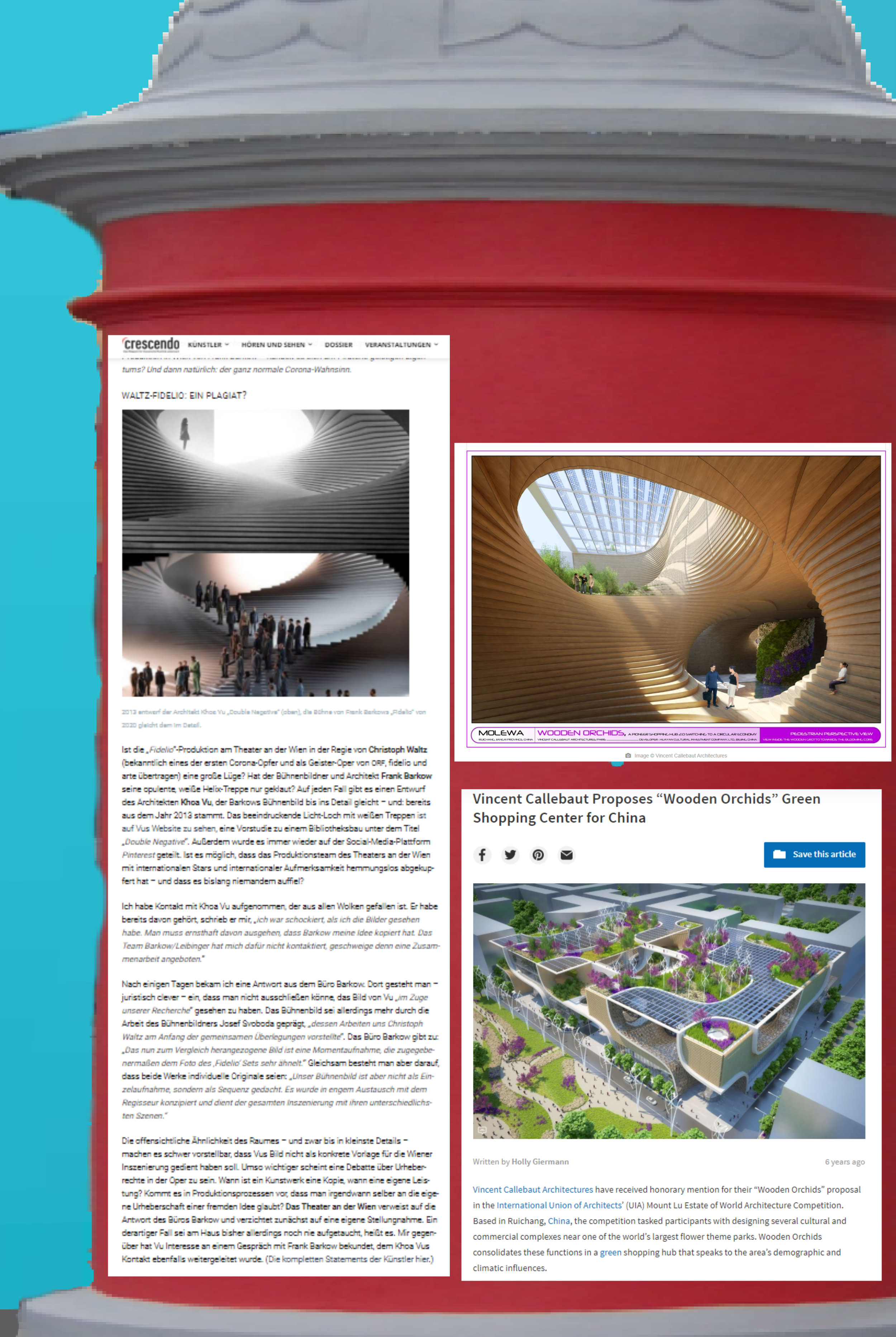 Die Treppe von Vincent Callebaut in seinem Einkaufszentrum in Ruichang, Provinz Jiangxi, könnte ebenso, wenn es denn eine Vorlage gab, Modell gestanden haben für die Treppe im Bühnenbild …