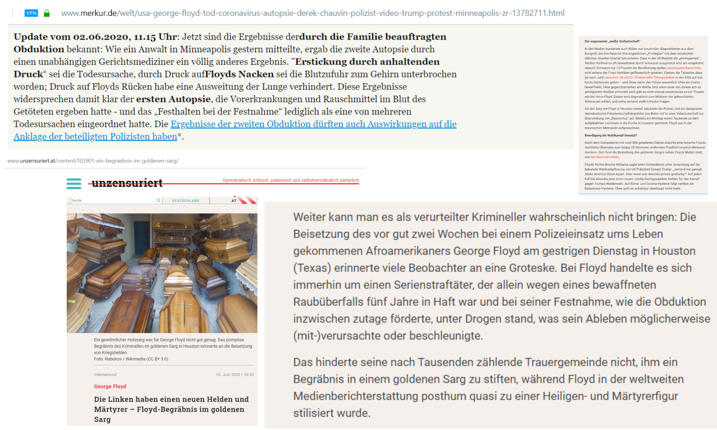 „Bei Floyd handelte es sich immerhin um einen Serienstraftäter, der allein wegen eines bewaffneten Raubüberfalls fünf Jahre in Haft war und bei seiner Festnahme, wie die Obduktion inzwischen zutage förderte, unter Drogen stand, was sein Ableben möglicherweise (mit-)verursachte oder beschleunigte.“