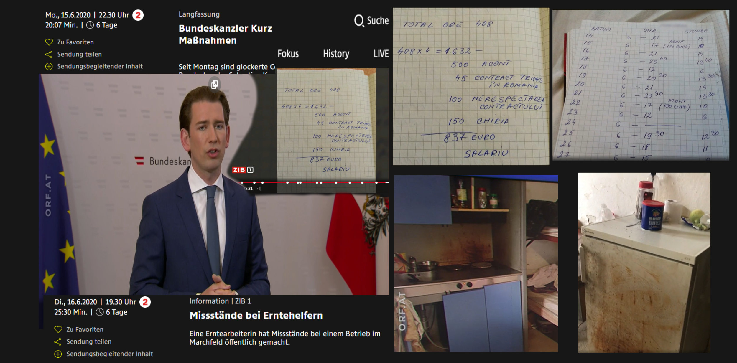 „Frau A. arbeitet regelmäßig in der Ernte. Harte Arbeit, das weiß sie. Erlebt sie eine böse Überraschung. Schlafen soll sie mit zehn anderen in einem völlig desolaten Haus. ‚Für mich war es furchtbar, einfach furchtbar, es gab Schimmel, Kakerlaken, das Fenster ließ sich nicht richtig schließen.‘ Auch die Arbeit sei härter gewesen als sonst. ‚Für mich war das Allerschlimmste, daß wir kaum Pausen hatten. Ich fand, daß wir wie Sklaven behandelt wurden. Das Verhalten der Auftraggeberin war einfach unmenschlich.‘ Seit Ende April habe sie keinen Tag freigehabt. In ihren Zeitaufzeichnungen notiert sie mitunter 14-Stunden-Tage. Am Ende soll ihr weniger Lohn bleiben als ausgemacht. Für das Quartier seien 150,00 Euro abgezogen worden, doppelt so viel wie laut Kollektivvertrag erlaubt. Außerdem 100,00 einer nicht näher definierten Pönale.“