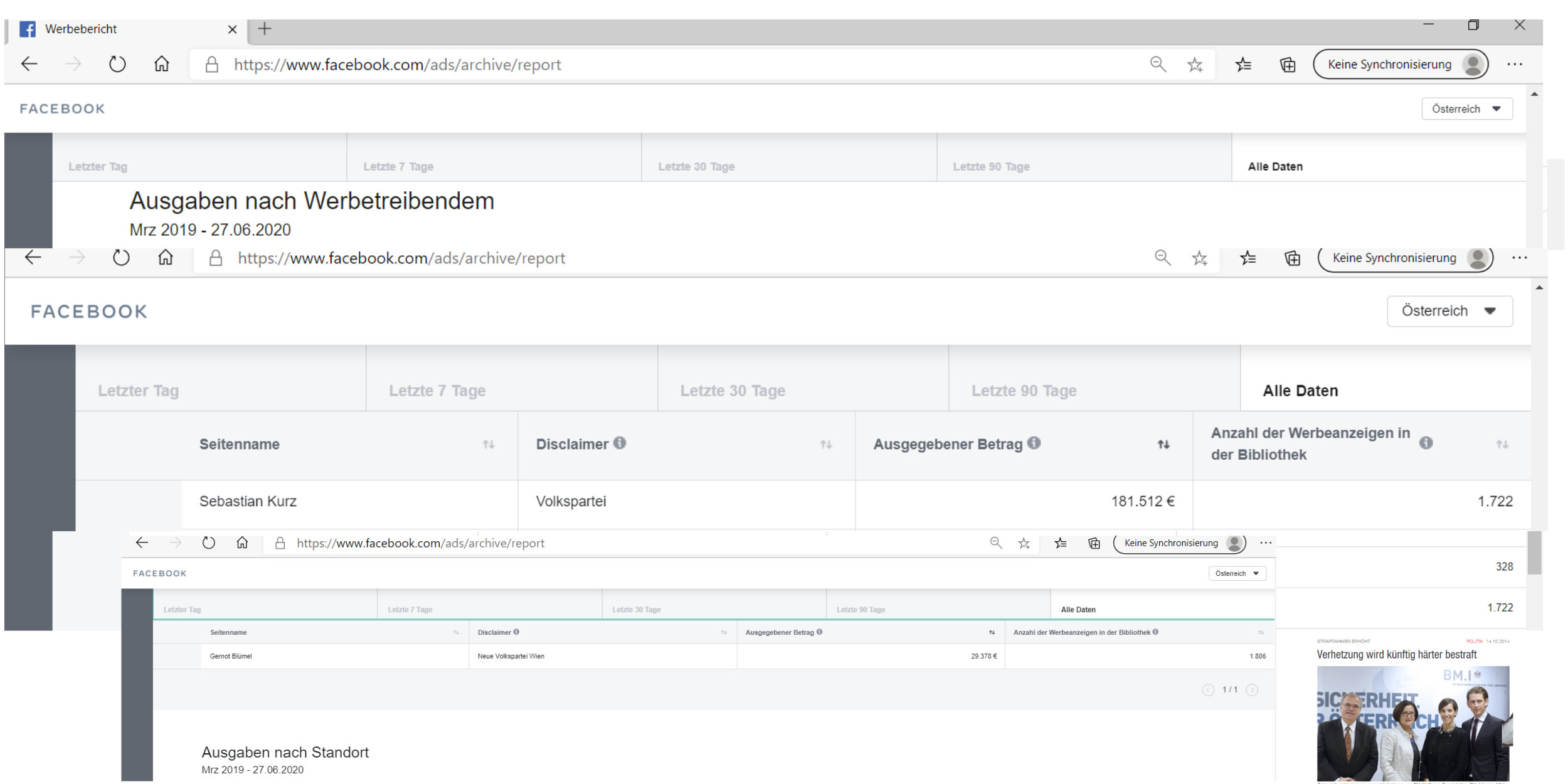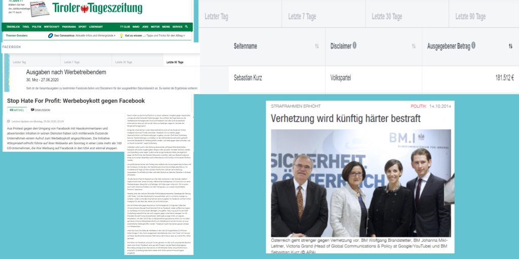Während es mittlerweile einen umfassenden und weitreichenden Werbeboykott besonders gegen den Konzern Facebook gibt, schalten politische Parteien nach wie vor Werbung beispielsweise auf Facebook, in Österreich etwa die ÖVP für Sebastian Kurz mit 181.512,00 Euro und für Gernot Blümel mit 29.378,00 Euro …