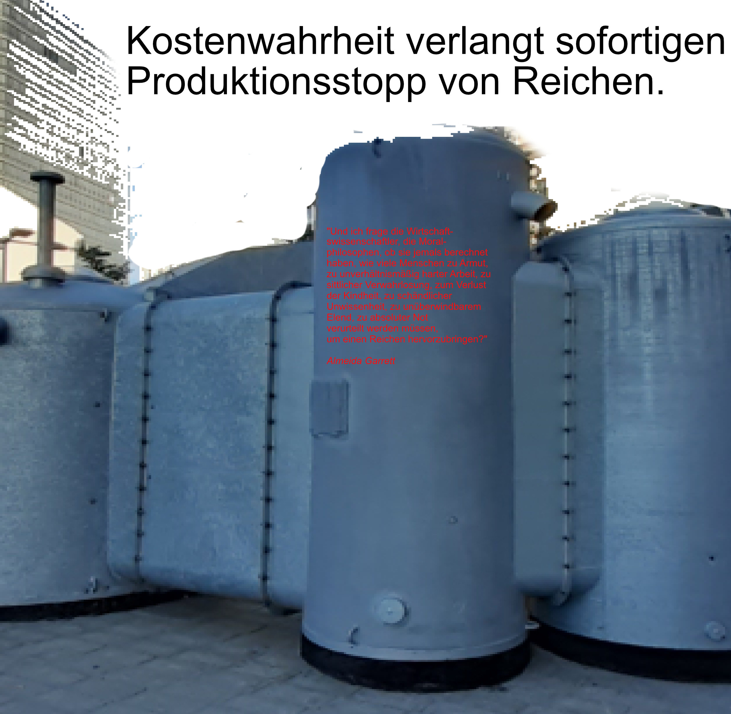 „Und ich frage die Wirtschaftswissenschaftler, die Moralphilosophen, ob sie jemals berechnet haben, wie viele Menschen zu Armut, zu unverhältnismäßig harter Arbeit, zu sittlicher Verwahrlosung, zum Verlust der Kindheit, zu schändlicher Unwissenheit, zu unüberwindbarem Elend, zu absoluter Not verurteilt werden müssen, um einen Reichen hervorzubringen?“