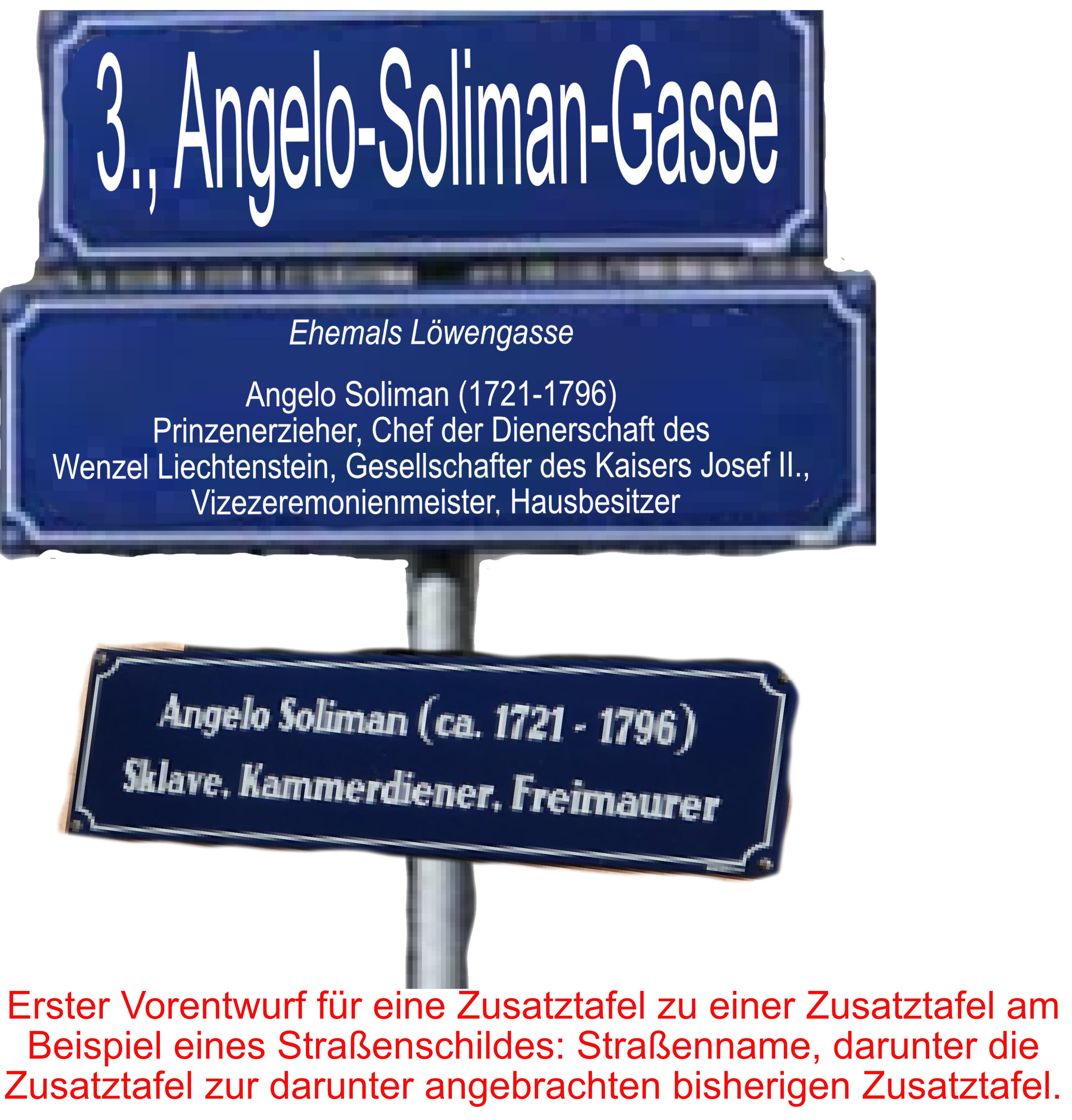 Die Notwendigkeit von Zusatztafeln wurde, wird berichtet, bereits bei einem ersten kurzen Rundgang durch die Innenstadt der Hauptstadt erkannt, bei einem Rundgang vom KL-Platz über den Franziskanerplatz in die Johannesgasse weiter zum Judenplatz, verfestigt hat sich, wird berichtet, die Einsicht in die Notwendigkeit von Zusatztafeln bereits beim Wechsel in den III. Bezirk zu einer vordringlichen Umsetzung. Bei einer eingelegten Pause auf dieser Wanderung am Kanal mit Blick auf den unterirdischen Angelo-Soliman-Weg auf der Löwengasse die Einsicht, es kann die Überprüfung nicht auf die Hauptstadt allein beschränkt bleiben, auch in Graz, auch in Klagenfurt, in Wieselburg, in Lackenbach, in Innsbruck, in Kirchstetten, kurzum, ausgedehnt auf das ganze Land …