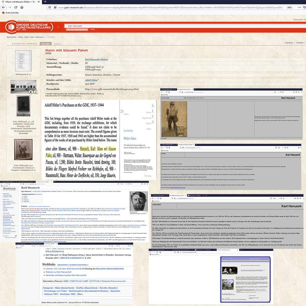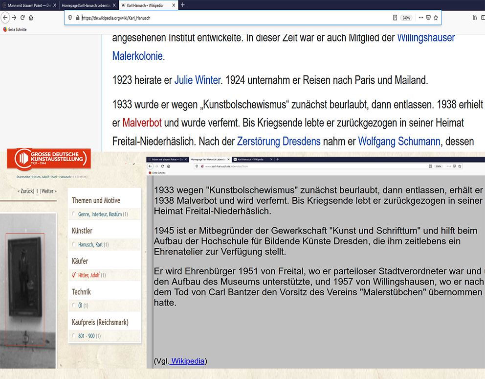 Es wird in dem Eintrag auf „Wikipedia“ auch erwähnt, das Bild „Mann mit blauem Paket“, in der Literaturliste auch ein Buch zur „großen deutschen Kunstausstellung, München 1937-1944“ angeführt. Berichtet aber wird nicht, daß Karl Hanusch 1938 mit diesem Bild auf der „Kunstausstellung“ vertreten war, daß der Käufer von dem „Mann mit blauem Paket“ Adolf Hitler war.