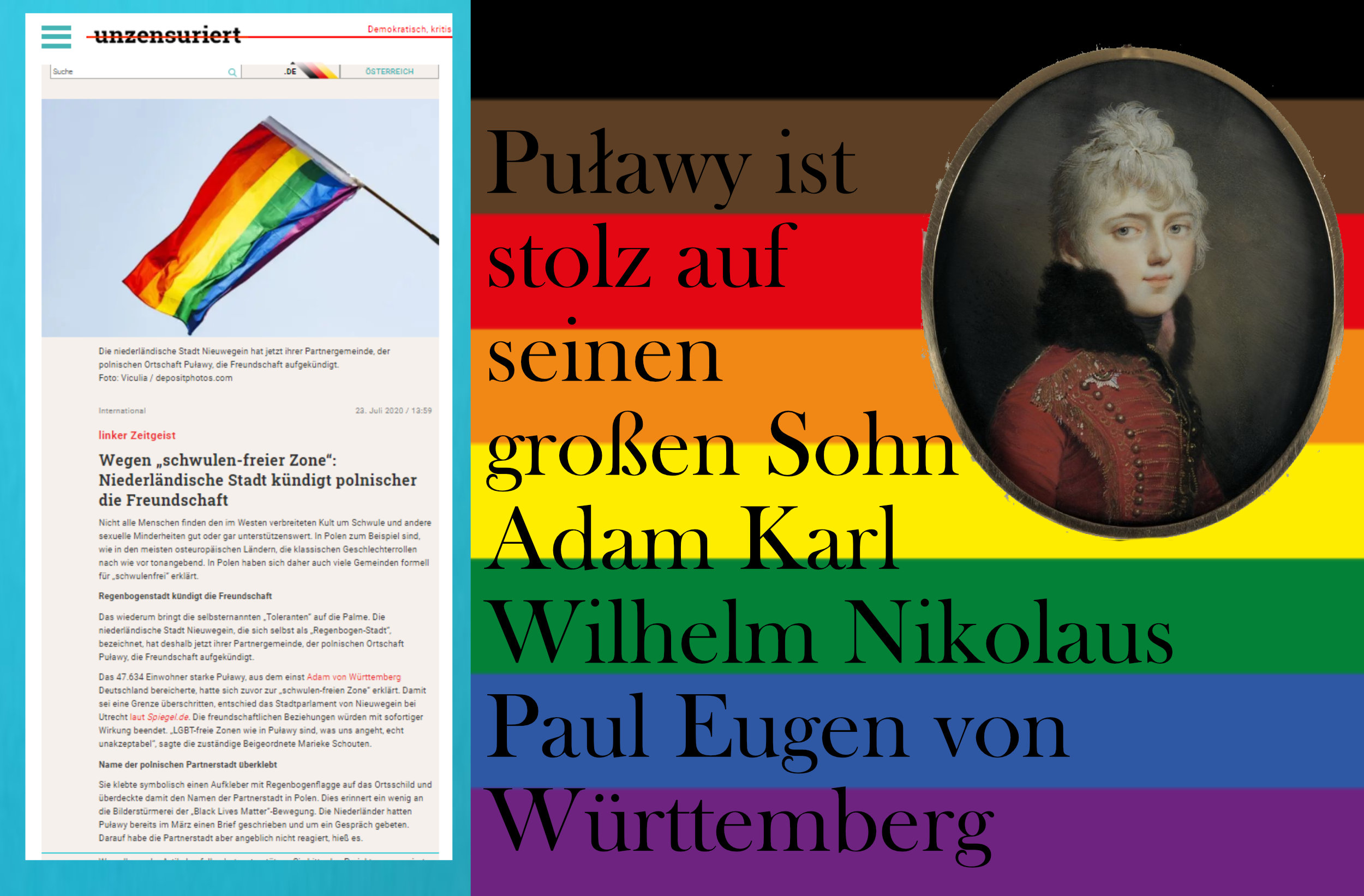 Dabei hätte sich doch gerade diese polnische Stadt mehr als nur Toleranz zu verdienen, schenkte sie doch Deutschland, wie die Website sogleich zu berichten weiß, einst Adam Württemberg, der „Deutschland“, wie die Website anerkennt, „bereicherte“, bereicherte mit seiner Orientierung eines niemals verheirateten Mannes.