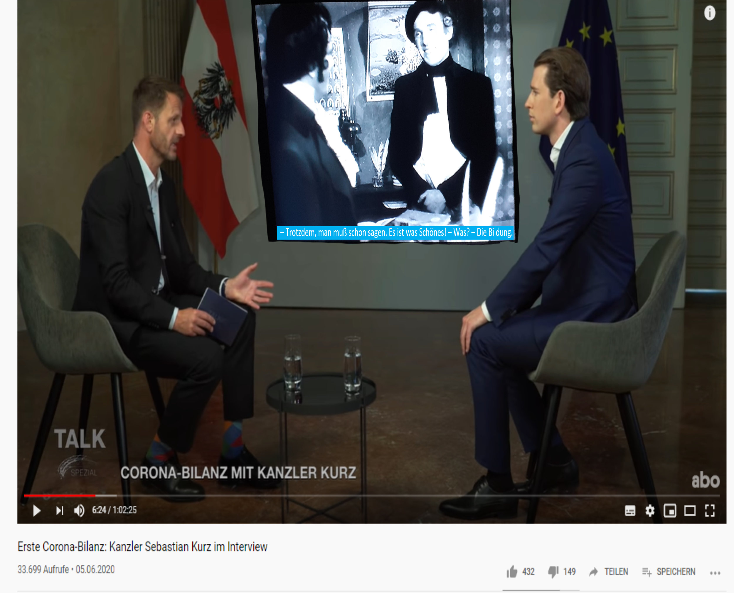 Das ist doch so. Sie können es nur von der Bildung her haben. Woher sonst kann es Sebastian Kurz haben, als von der Bildung, das Wissen, wer „ein so gebildeter Mensch“ ist und wer „ein eigenes Hirn hat“, und woher sonst kann es Gernot Blümel haben, als von der Bildung, das Wissen, daß das, was einer redet, „ja ein Blödsinn ist“ …
