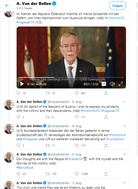 Was ihm etwa am 6. August 2020 so leicht über die Lippen kommt, verbreitet auf Twitter, mit über 196 Tausend „Followern“, zu den Atombombenabwürfen vor 75 Jahren, und auch auf der offiziellen Website des Bundespräsidenten, wäre endlich und wichtig auf den offiziellen Kanälen eines österreichischen Bundespräsidenten zum breitesten und offiziellen Eingeständnis not, in etwas abgeänderter Form seiner Bekanntgabe zu Hiroshima und Nagasaki: